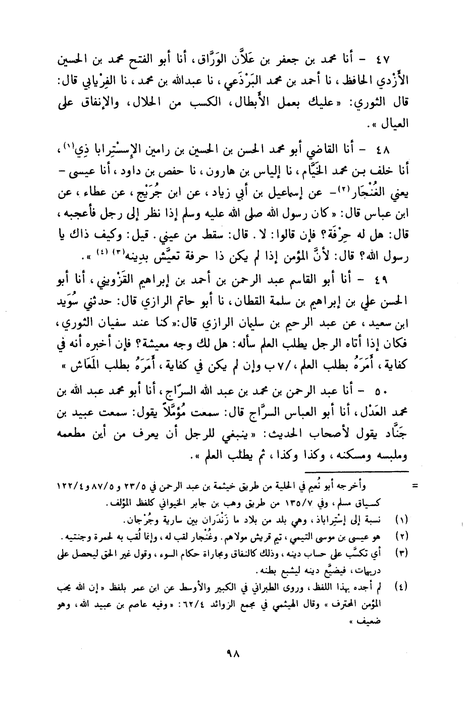 47 - أنا مُحَمَّدُ بْنُ جَعْفَرِ بْنِ عَلَّانَ الْوَرَّاقُ، أنا أَبُو الْفَتْحِ مُحَمَّدُ بْنُ الْحُسَيْنِ الْأَزْدِيُّ الْحَافِظُ، نا أَحْمَدُ بْنُ مُحَمَّدٍ الْبَرْذَعِيُّ، نا عَبْدُ اللَّهِ بْنُ مُحَمَّدٍ، نا الْفِرْيَابِيُّ، قَالَ: قَالَ الثَّوْرِيُّ: " §عَلَيْكَ بِعَمَلِ الْأَبْطَالِ: الْكَسْبُ مِنَ الْحَلَالِ، وَالْإِنْفَاقُ عَلَى الْعِيَالِ "