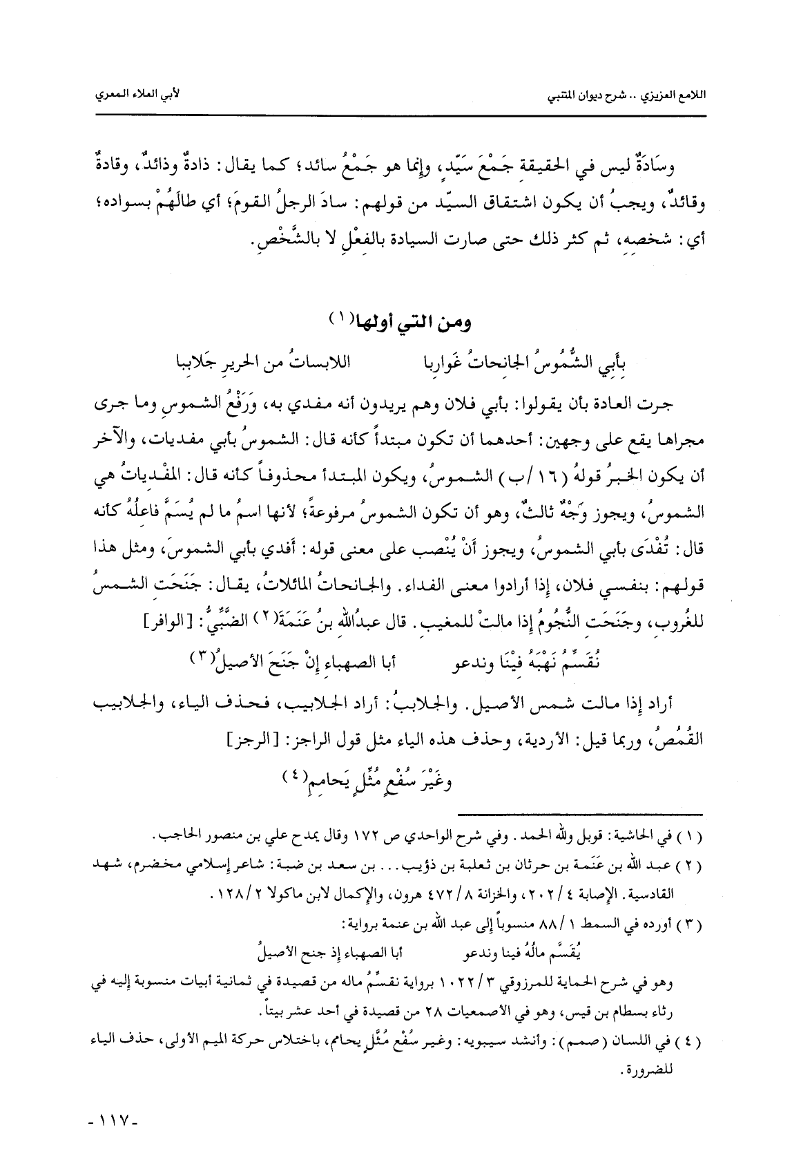جرت العادة بأن يقولوا: بأبي فلان وهم يريدون أنه مفدي به, ورفع الشموس وما جرى مجراها يقع على وجهين: أحدهما أن تكون مبتدأ كأنه قال: الشموس بأبي مفديات, والآخر أن يكون الخبر قوله (16/ب) الشموس, ويكون المبتدأ محذوفًا كأنه قال: المفديات هي الشموس, ويجوز وجه ثالث, وهو أن تكون الشموس مرفوعةً؛ لأنها اسم ما لم يسم فاعله كأنه قال: تفدى بأبي الشموس, ويجوز أن ينصب على معنى قوله: أفدي بأبي الشموس, ومثل هذا قوله: بنفسي فلان, إذا أرادوا معنى الفداء. والجانحات المائلات, يقال: جنحت الشمس للغروب, وجنحت النجوم إذا مالت للمغيب. قال عبد الله بن عنمة الضبي: [الوافر]