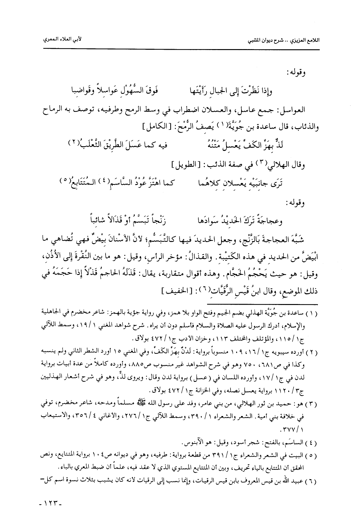 العواسل: جمع عاسل, والعسلان اضطراب في وسط الرمح وطرفيه, توصف به الرماح والذئاب, قال ساعدة بن جوية يصف الرمح: [الكامل]