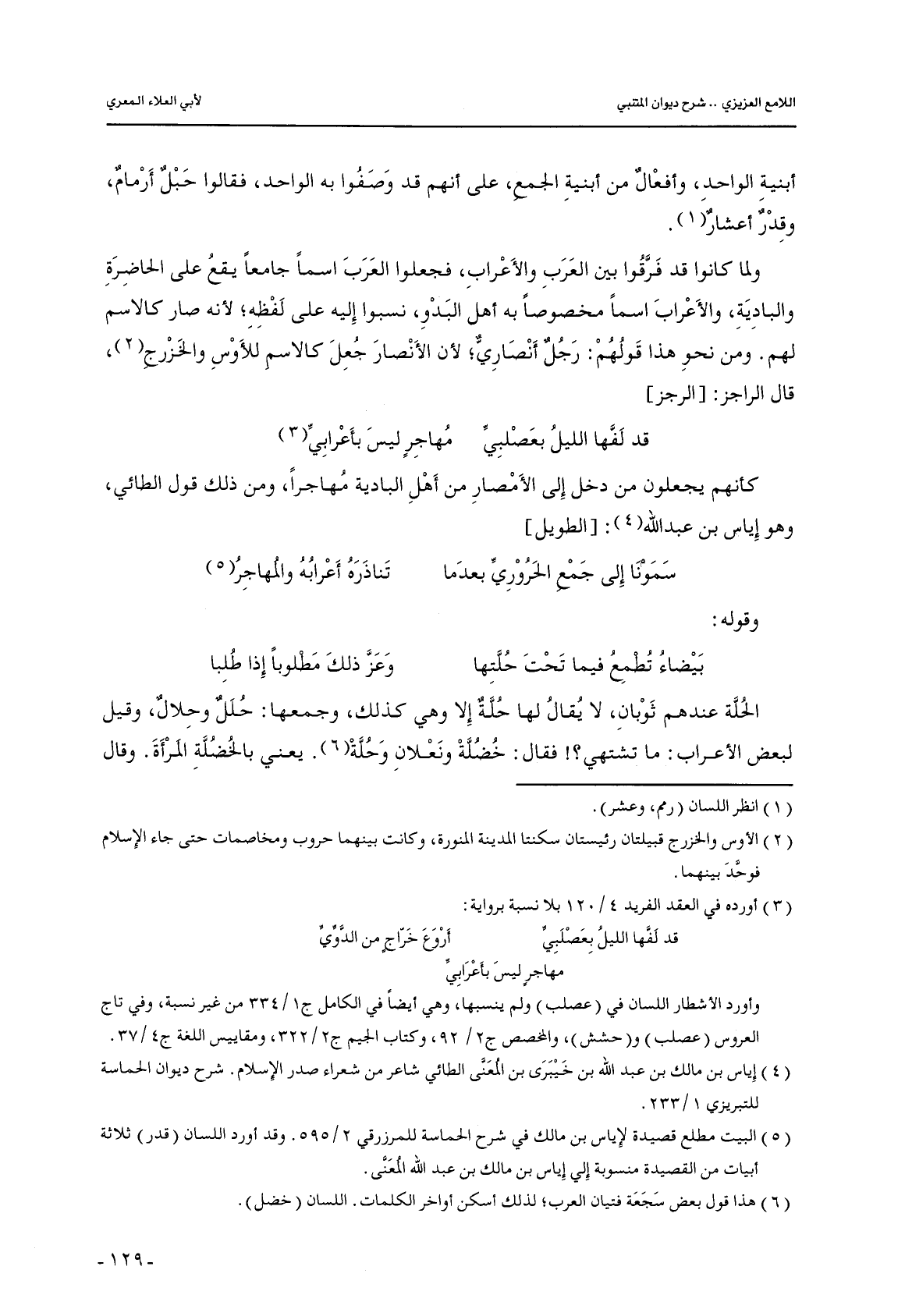 ولما كانوا قد فرقوا بين العرب والأعراب, فجعلوا العرب اسمًا جامعًا يقع على الحاضرة والبادية, والأعراب اسمًا مخصوصًا به أهل البدو, نسبوا إليه على لفظه؛ لأنه صار كالاسم لهم. ومن نحو هذا قولهم: رجل أنصاري؛ لأن الأنصار جعل كالاسم للأوس والخزرج, قال الراجز: [الرجز]