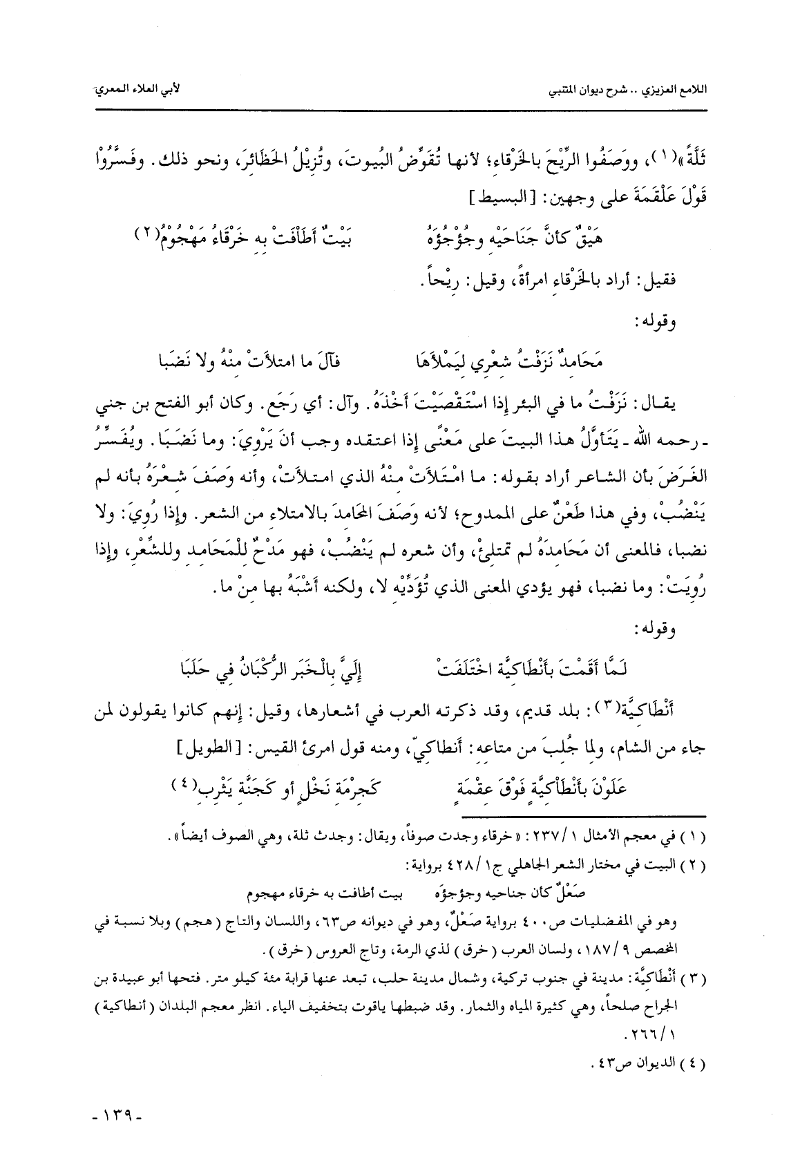 يقال: نزفت ما في البئر إذا استقصيت أخذه. وآل: أي رجع. وكان أبو الفتح بن جني - رحمه الله - يتأول هذا البيت على معنى إذا اعتقده وجب أن يروي: وما نضبا. ويفسر الغرض بأن الشاعر أراد بقوله: ما امتلأت منه الذي امتلأت, وأنه وصف شعره بأنه لم ينضب, وفي هذا طعن على الممدوح؛ لأنه وصف المحامد بالامتلاء من الشعر. وإذا روي: ولا نضبا, فالمعنى أن محامده لم تمتلئ, وأن شعره لم ينضب, فهو مدح للمحامد وللشعر, وإذا رويت: وما نضبا, فهو يؤدي المعنى الذي تؤديه لا, ولكنه أشبه بها من ما.