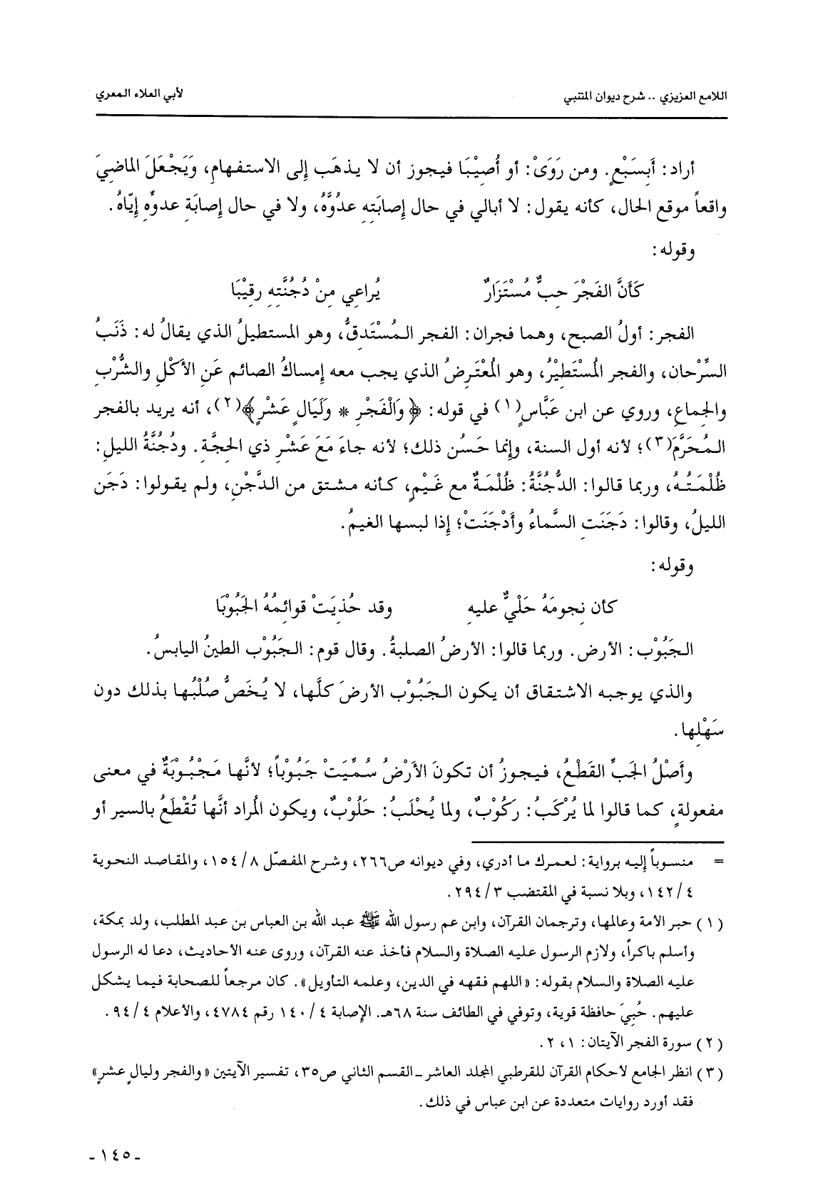 الفجر: أول الصبح, وهما فجران: الفجر المستدق, وهو المستطيل الذي يقال له: ذنب السرحان, والفجر المستطير, وهو المعترض الذي يجب معه إمساك الصائم عن الأكل والشرب والجماع, وروي عن ابن عباسٍ في قوله: {والفجر * وليالٍ عشر} , أنه يريد بالفجر المحرم؛ لأنه أول السنة, وإنما حسن ذلك؛ لأنه جاء مع عشر ذي الحجة. ودجنة الليل: ظلمته, وربما قالوا: الدجنة: ظلمة مع غيمٍ, كأنه مشتق من الدجن, ولم يقولوا: دجن الليل, وقالوا: دجنت السماء وأدجنت؛ إذا لبسها الغيم