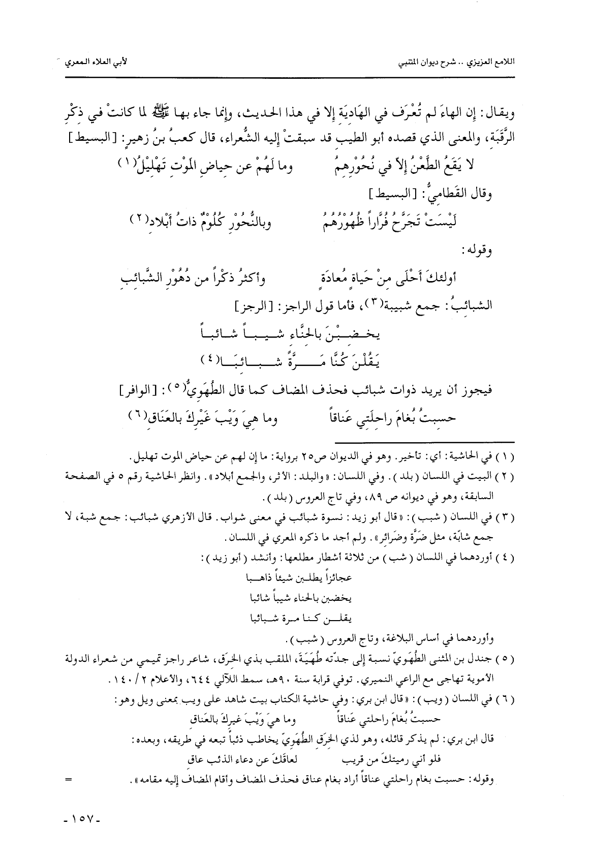 ويقال: إن الهاء لم تعرف في الهادية إلا في هذا الحديث, وإنما جاء بها صلى الله عليه وسلم لما كانت في ذكر الرقبة, والمعنى الذي قصده أبو الطيب قد سبقت إليه الشعراء, قال كعب بن زهيرٍ: [البسيط]