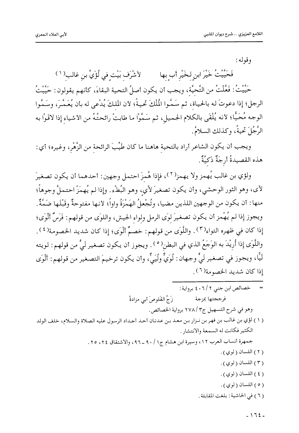 ولؤي بن غالب يهمز ولا يهمز, فإذا همز احتمل وجهين: أحدهما أن يكون تصغير لأى, وهو الثور الوحشي, وأن يكون تصغير لأي, وهو البطء. وإذا لم يهمز احتمل وجوهًا؛ منها: أن يكون من الوجهين اللذين مضيا, وتجعل الهمزة واواً؛ لأنها مفتوحة وقبلها ضمة. ويجوز إذا لم يهمز أن يكون تصغير لوى الرمل ولواء الجيش, واللوى من قولهم: فرس ألوى؛ إذا كان في ظهره التواء. واللوى من قولهم: خصم ألوى؛ إذا كان شديد الخصومة. واللوى إذا أريد به الوجع الذي في البطن. ويجوز أن يكون تصغير لي من قولهم: لويته ليا, ويجوز في تصغير لي وجهان: لوي وليي, وأن يكون ترخيم التصغير من قولهم: ألوى إذا كان شديد الخصومة.