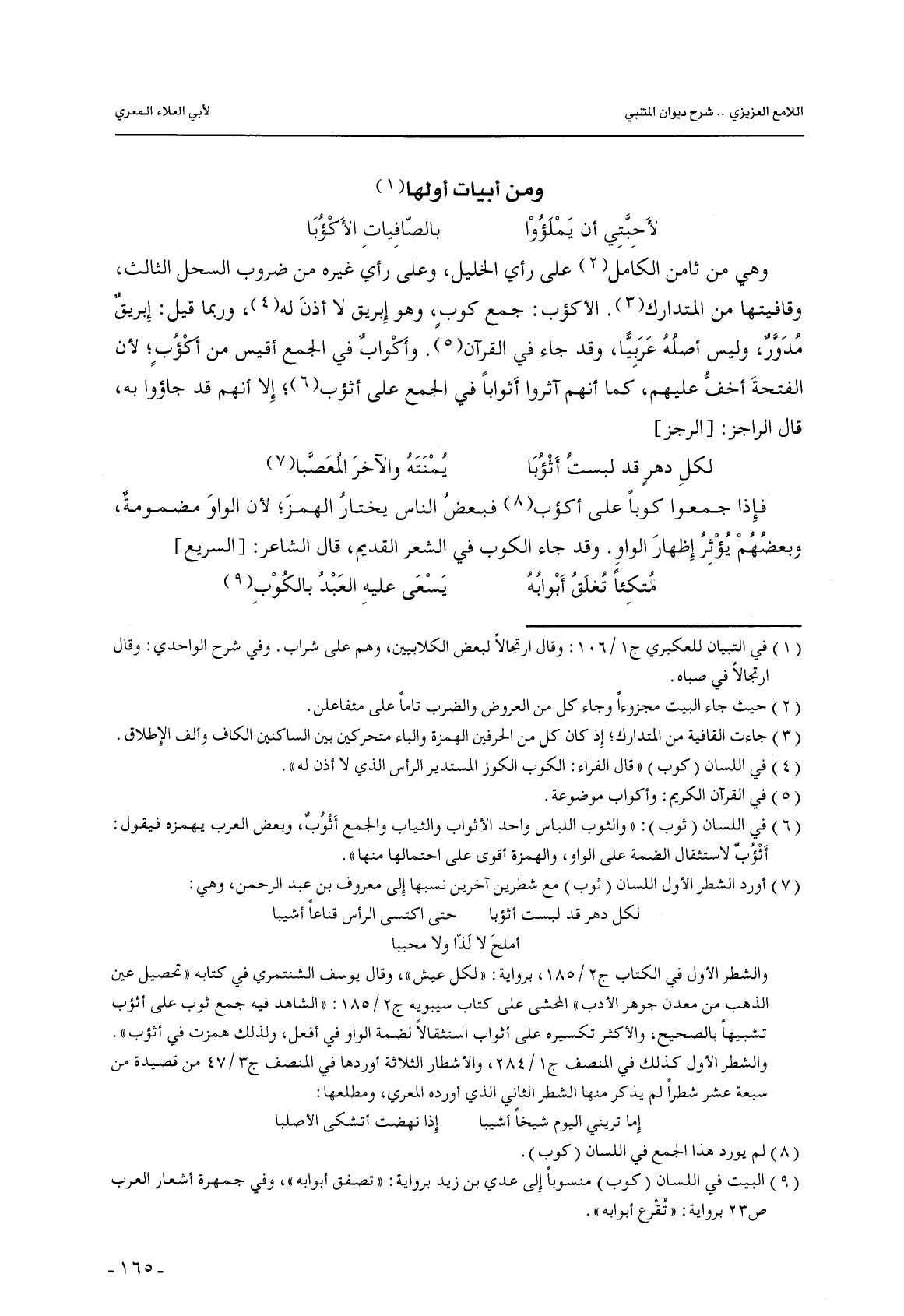 وهي من ثامن الكامل على رأي الخليل, وعلى رأي غيره من ضروب السحل الثالث, وقافيتها من المتدارك. الأكؤب: جمع كوبٍ, وهو إبريق لا أذن له, وربما قيل: إبريق مدور, وليس أصله عربيًا, وقد جاء في القرآن. وأكواب في الجمع أقيس من أكؤبٍ؛ لأن الفتحة أخف عليهم, كما أنهم آثروا أثوابًا في الجمع على أثؤب؛ إلا أنهم قد جاؤوا به, قال الراجز: [الرجز]