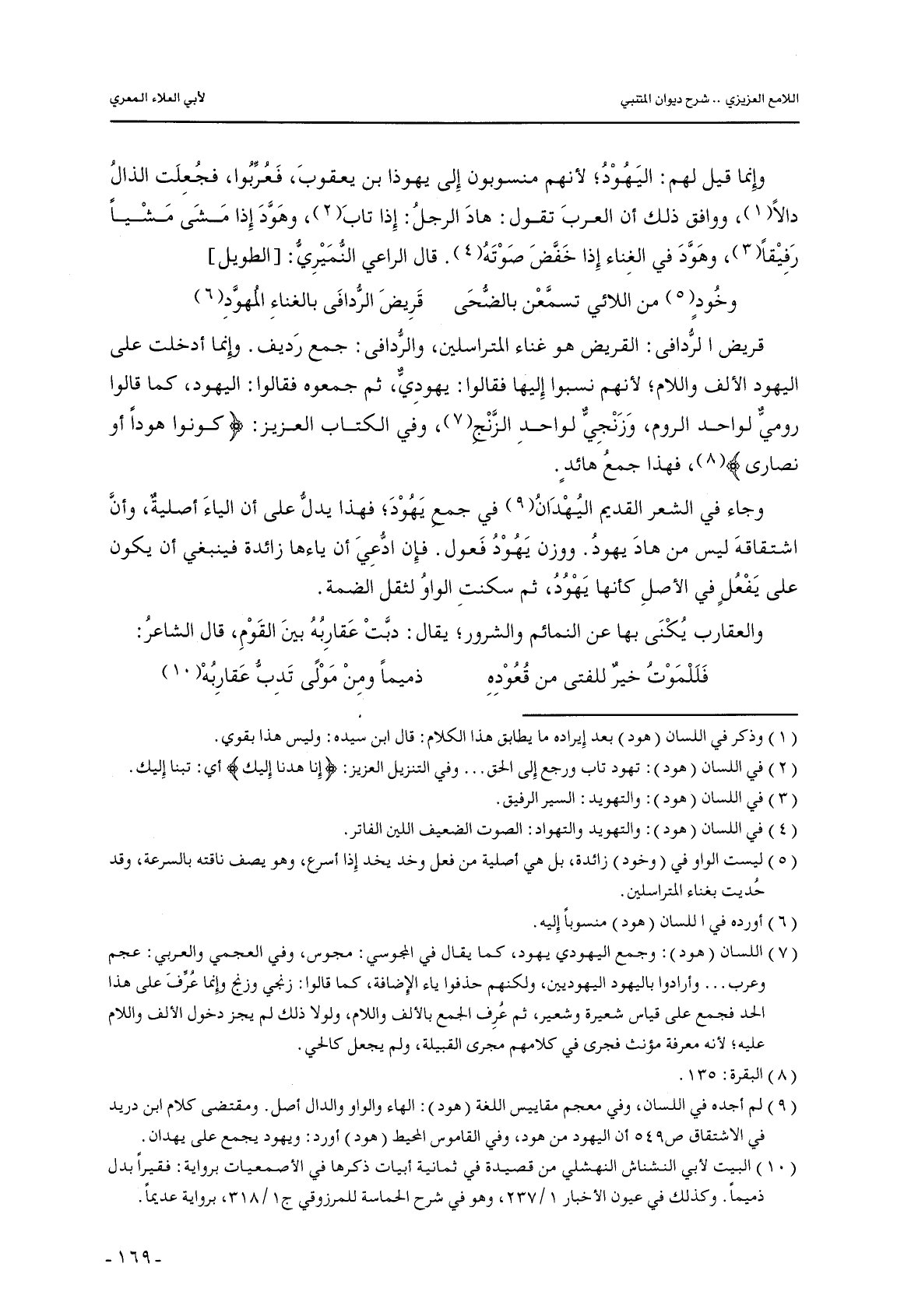 قريض الردافى: القريض هو غناء المتراسلين, والردافى: جمع رديف. وإنما أدخلت على اليهود الألف واللام؛ لأنهم نسبوا إليها فقالوا: يهودي, ثم جمعوه فقالوا: اليهود, كما قالوا رومي لواحد الروم, وزنجي لواحد الزنج, وفي الكتاب العزيز: {كونوا هودًا أو نصارى} , فهذا جمع هائدٍ.