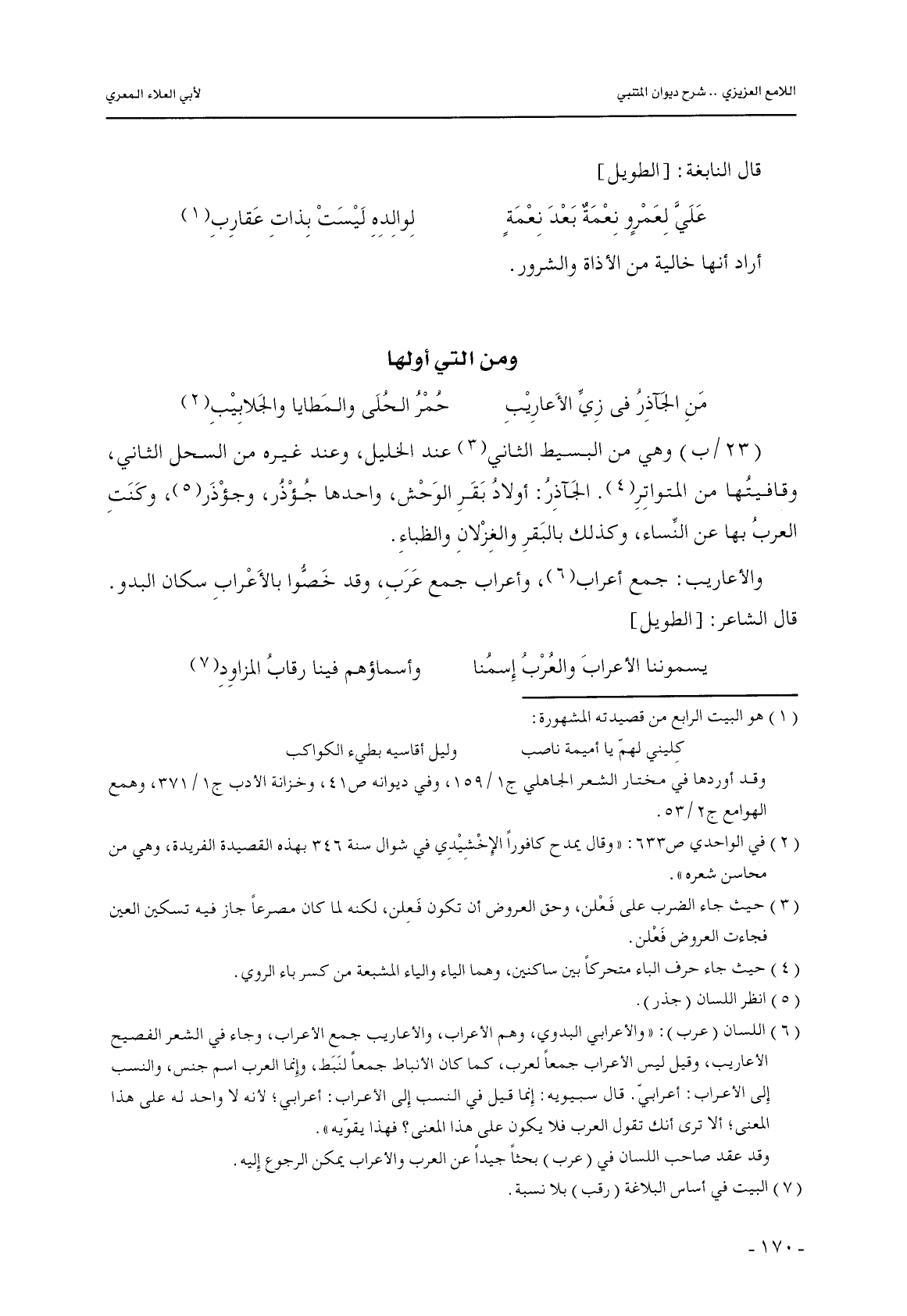 (23/ب) وهي من البسيط الثاني عند الخليل, وعند غيره من السحل الثاني, وقافيتها من المتواتر. الجآذر: أولاد بقر الوحش, واحدها جؤذر, وجؤذر, وكنت العرب بها عن النساء, وكذلك بالبقر والغزلان والظباء.