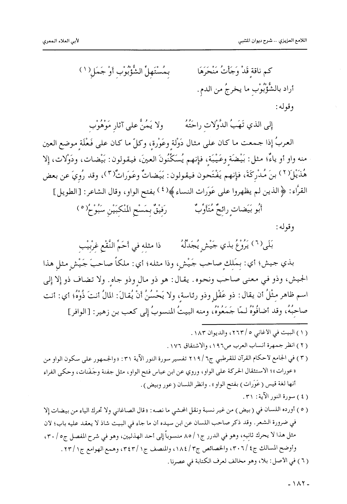 العرب إذا جمعت ما كان على مثال دولةٍ وعورةٍ, وكلّ ما كان على فعلةٍ موضع العين منه واو أو ياء؛ مثل: بيضةٍ وعيبةٍ, فإنهم يسكنون العين, فيقولون: بيضات, ودولات, إلا هذيل بن مدركة, فإنهم يفتحون فيقولون: بيضات وعورات, وقد روي عن بعض القراء: {الذين لم يظهروا على عورات النساء} بفتح الواو, وقال الشاعر: [الطويل]