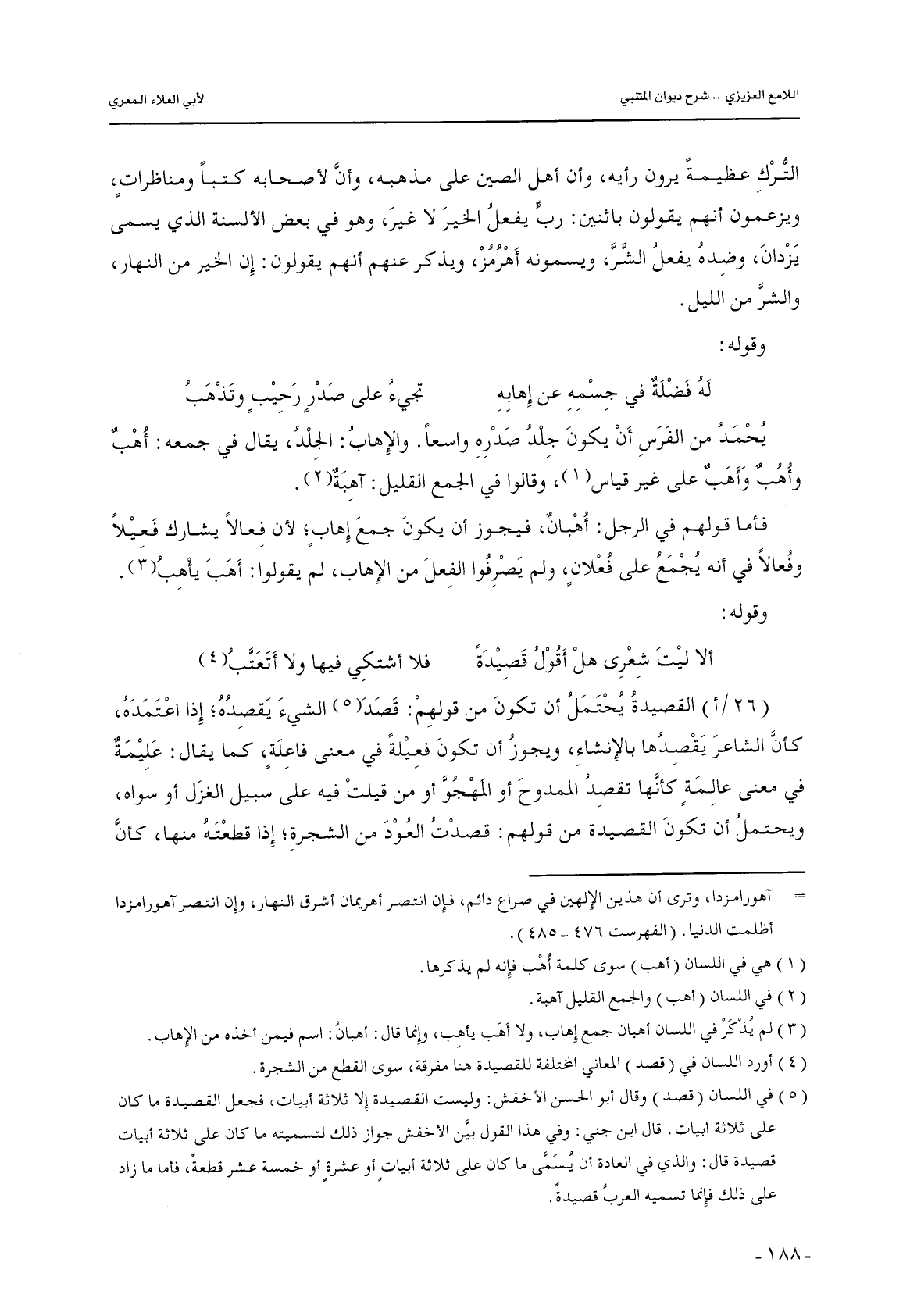 (26/أ) القصيدة يحتمل أن تكون من قولهم: قصد الشيء يقصده؛ إذا اعتمده, كأن الشاعر يقصدها بالإنشاء, ويجوز أن تكون فعيلةً في معنى فاعلةٍ, كما يقال: عليمة في معنى عالمةٍ كأنها تقصد الممدوح أو المهجو أو من قيلت فيه على سبيل الغزل أو سواه, ويحتمل أن تكون القصيدة من قولهم: قصدت العود من الشجرة؛ إذا قطعته منها, كأن