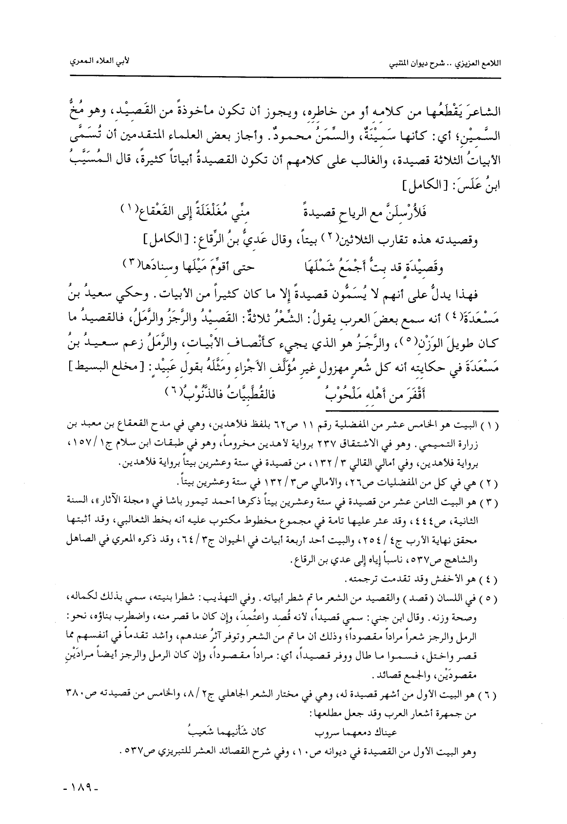 الشاعر يقطعها من كلامه أو من خاطره, ويجوز أن تكون مأخوذةً من القصيد, وهو مخ السمين؛ أي: كأنها سمينة, والسمن محمود. وأجاز بعض العلماء المتقدمين أن تسمى الأبيات الثلاثة قصيدة, والغالب على كلامهم أن تكون القصيدة أبياتًا كثيرةً, قال المسيب ابن علس: [الكامل]