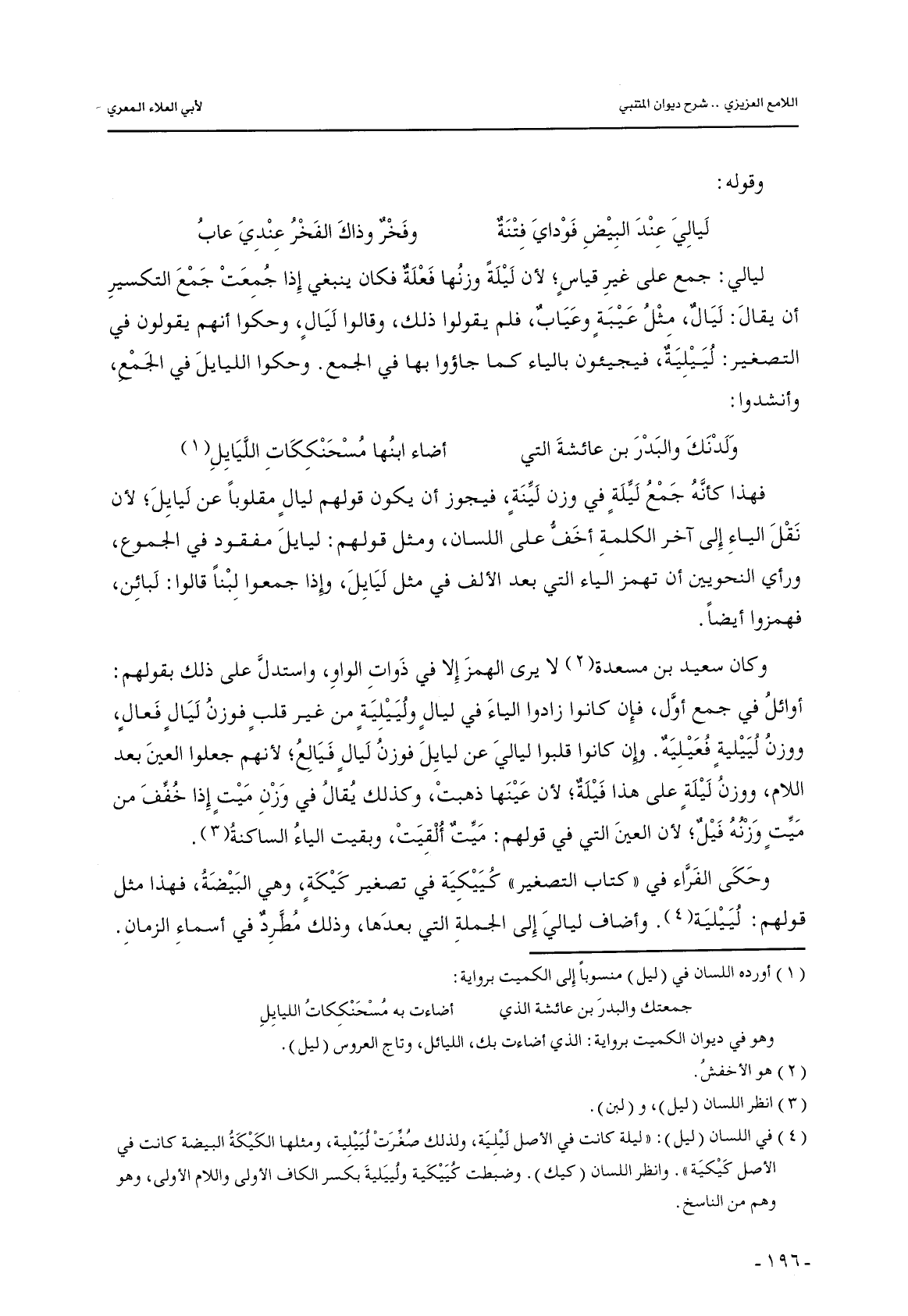 ليالي: جمع على غير قياسٍ؛ لأن ليلةً وزنها فعلة فكان ينبغي إذا جمعت جمع التكسير أن يقال: ليال, مثل عيبةٍ وعياب, فلم يقولوا ذلك, وقالوا ليالٍ, وحكوا أنهم يقولون في التصغير: لييلية, فيجيئون بالياء كما جاؤوةا بها في الجمع. وحكوا الليايل في الجمع, وأنشدوا: