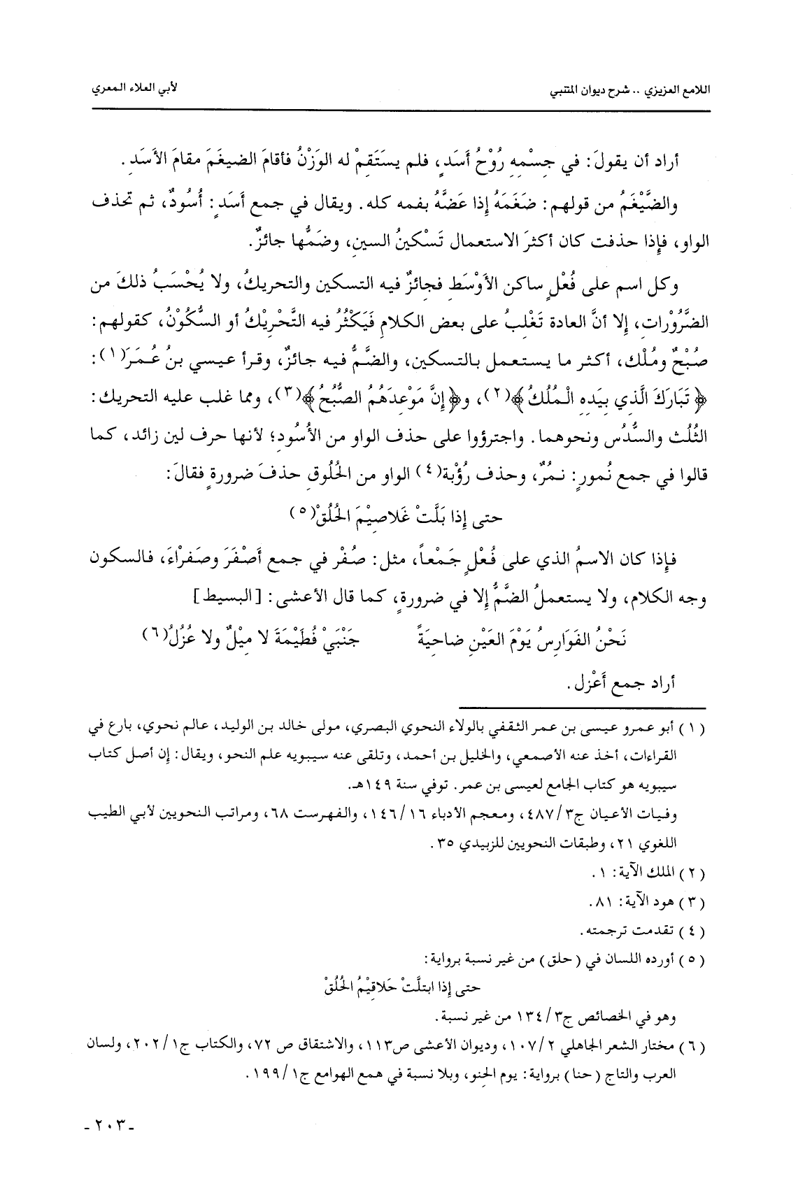 وكل اسم على فعلٍ ساكن الأوسط فجائز فيه التسكين والتحريك, ولا يحسب ذلك من الضرورات, إلا أن العادة تغلب على بعض الكلام فيكثر فيه التحريك أو السكون, كقولهم: صبح وملك, أكثر ما يستعمل بالتسكين, والضم فيه جائز, وقرأ عيسي بن عمر: {تبارك الذي بيده الملك} , و {إن موعدهم الصبح} , ومما غلب عليه التحريك: الثلث والسدس ونحوهما. واجترؤوا على حذف الواو من الأسود؛ لأنها حرف لين زائد, كما قالوا في جمع نمورٍ: نمر, وحذف رؤبة الواو من الحلوق حذف ضرورةٍ فقال: