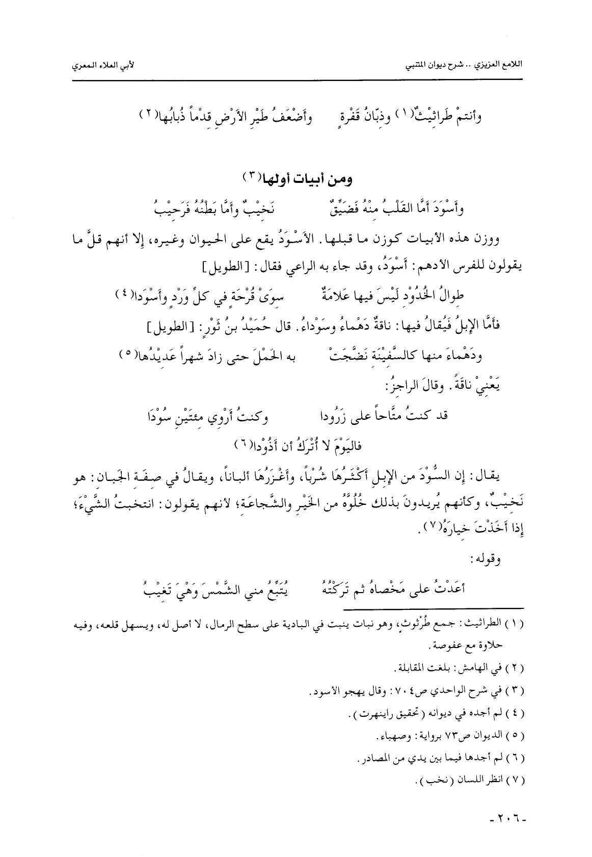 ووزن هذه الأبيات كوزن ما قبلها. الأسود يقع على الحيوان وغيره, إلا أنهم قل ما يقولون للفرس الأدهم: أسود, وقد جاء به الراعي فقال: [الطويل]