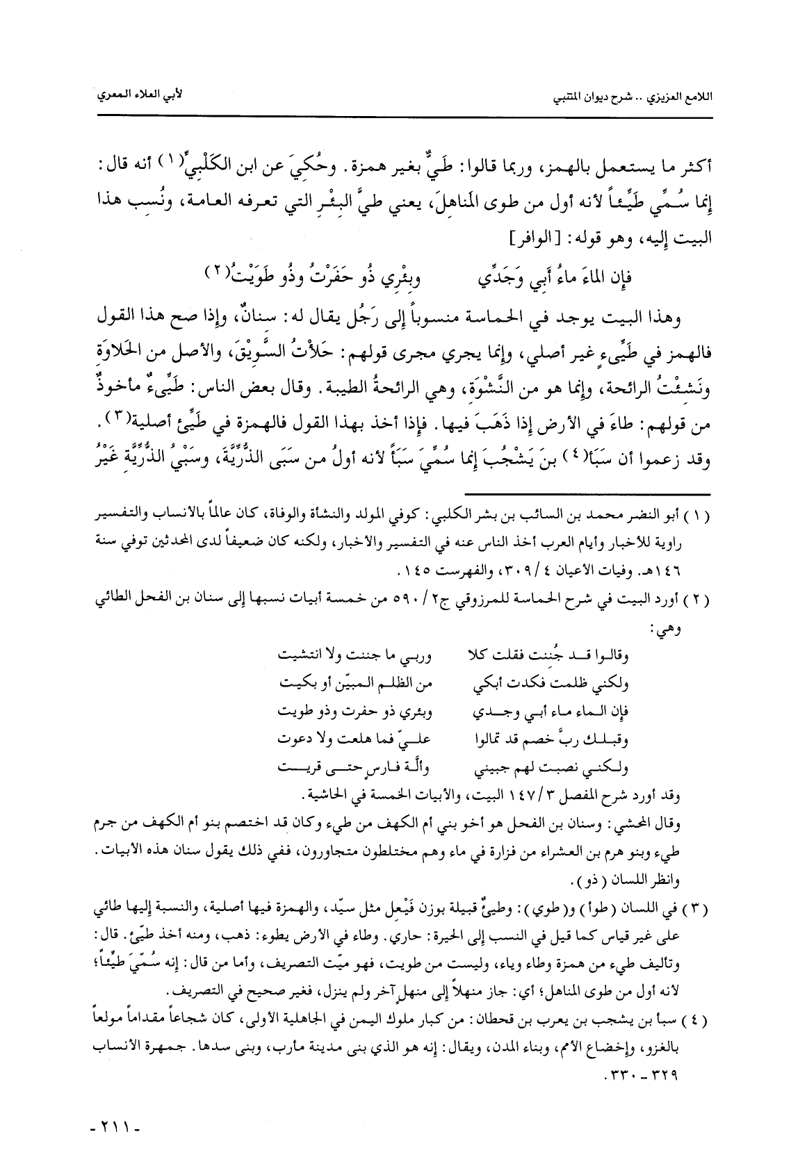 أكثر ما يستعمل بالهمز, وربما قالوا: طي بغير همزة. وحكي عن ابن الكلبي أنه قال: إنما سمي طيئًا لأنه أول من طوى المناهل, يعني طي البئر التي تعرفه العامة, ونسب هذا البيت إليه, وهو قوله: [الوافر]