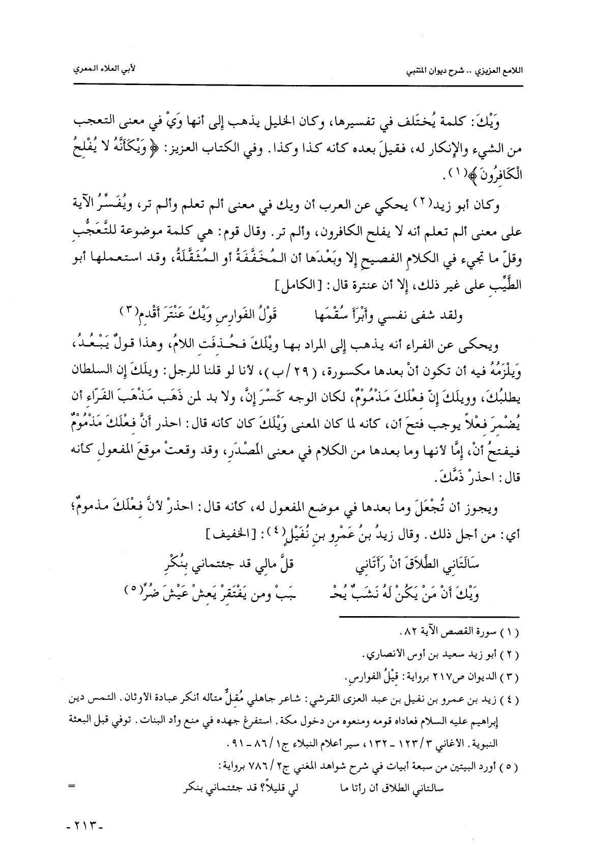 وكان أبو زيد يحكي عن العرب أن ويك في معنى ألم تعلم وألم تر, ويفسر الآية على معنى ألم تعلم أنه لا يفلح الكافرون, وألم تر. وقال قوم: هي كلمة موضوعة للتعجب وقل ما تجيء في الكلام الفصيح إلا وبعدها أن المخففة أو المثقلة, وقد استعملها أبو الطيب على غير ذلك, إلا أن عنترة قال: [الكامل]