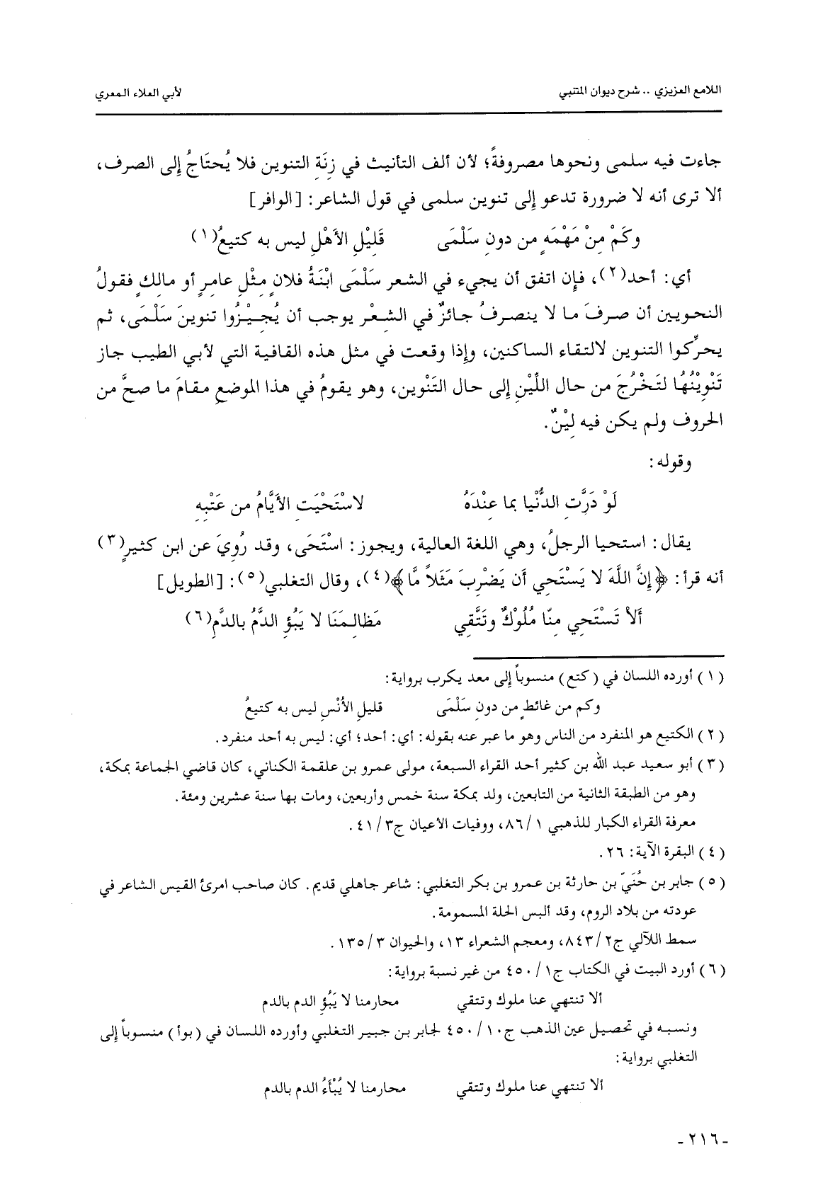 أي: أحد, فإن اتفق أن يجيء في الشعر سلمى ابنة فلان مثل عامرٍ أو مالك فقول النحويين أن صرف ما لا ينصرف جائز في الشعر يوجب أن يجيزوا تنوين سلمى, ثم يحركوا التنوين لالتقاء الساكنين, وإذا وقعت في مثل هذه القافية التي لأبي الطيب جاز تنوينها لتخرج من حال اللين إلى حال التنوين, وهو يقوم في هذا الموضع مقام ما صح من الحروف ولم يكن فيه لين.