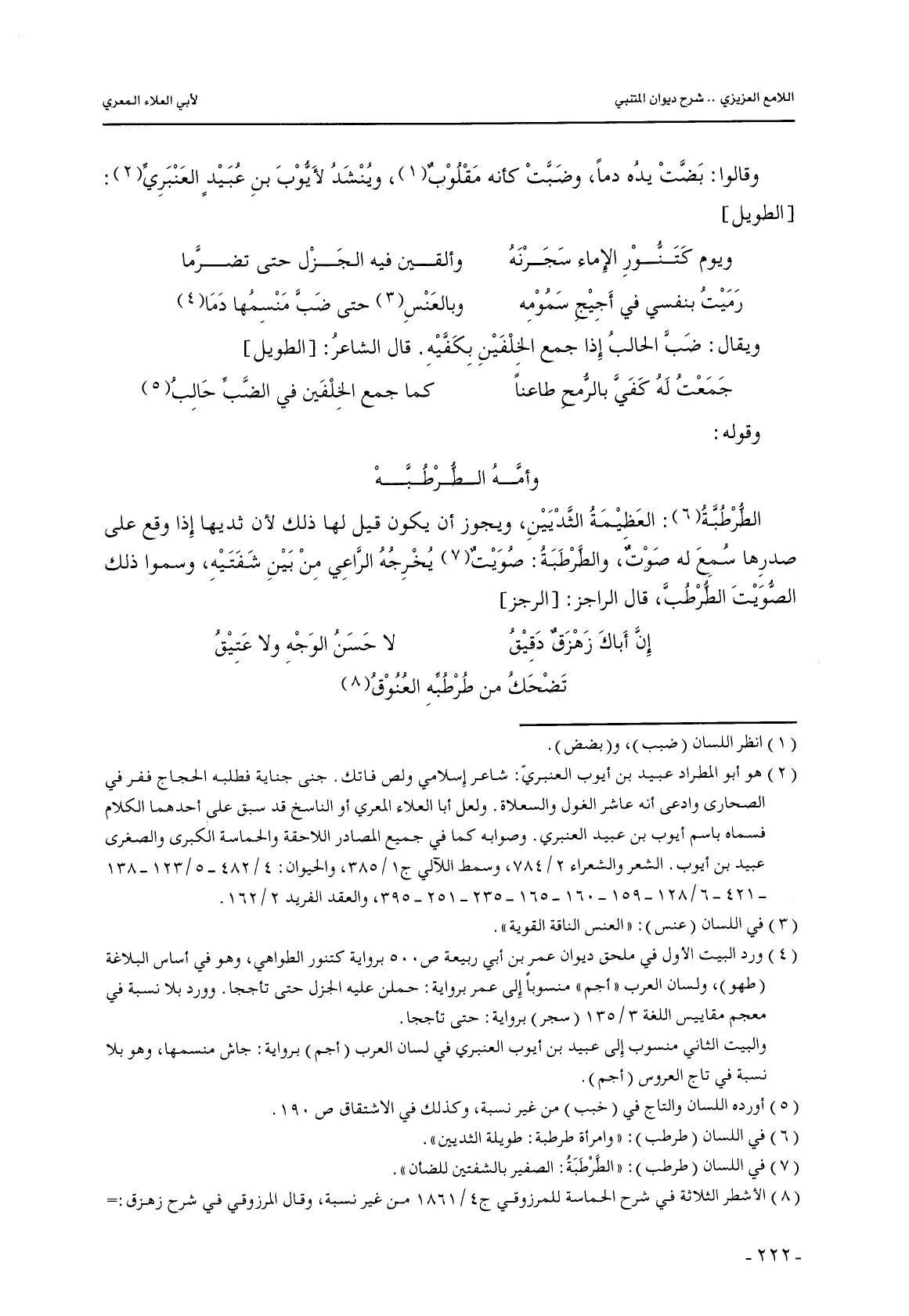 وقالوا: بضت يده دمًا, وضبت كأنه مقلوب, وينشد لأيوب بن عبيدٍ العنبري: [الطويل]