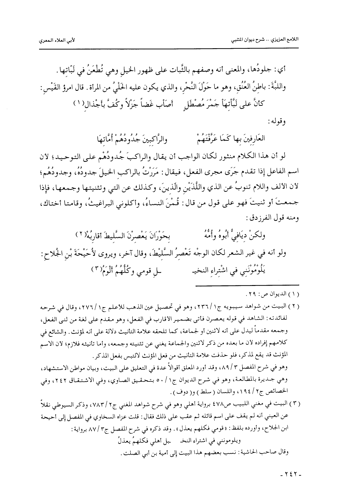 لو أن هذا الكلام منثور لكان الواجب أن يقال والراكب جدودهم على التوحيد؛ لأن اسم الفاعل إذا تقدم جرى مجرى الفعل, فيقال: مررت بالراكب الخيل جدوده, وجدودهم؛ لأن الألف واللام تنوب عن الذي واللذين والذين, وكذلك عن التي وتثنيتها وجمعها, فإذا جمعت أو ثنيت فهو على قول من قال: قمن النساء, وأكلوني البراغيث, وقامتا أختاك, ومنه قول الفرزدق: