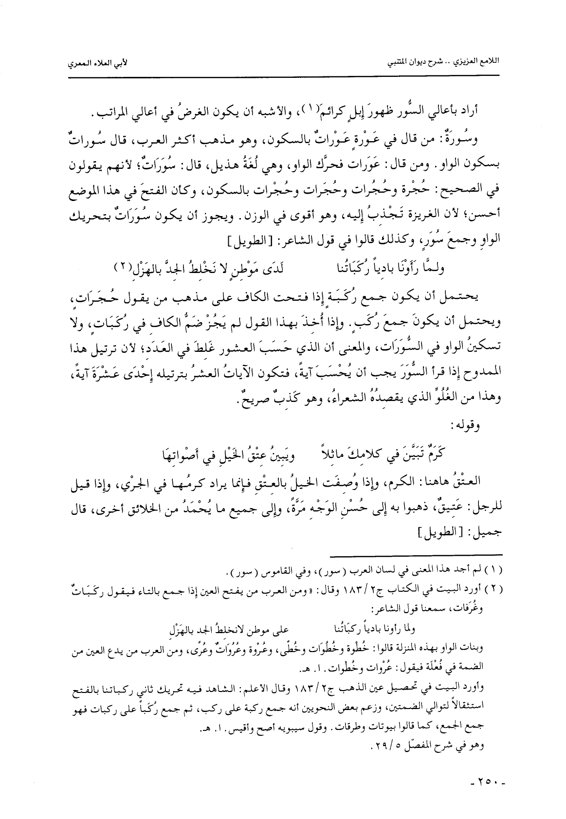 يحتمل أن يكون جمع ركبةٍ إذا فتحت الكاف على مذهب من يقول حجراتٍ, ويحتمل أن يكون جمع ربٍ. وإذا أخذ بهذا القول لم يجز ضم الكاف في ركباتٍ, ولا تسكين الواو في السورات, والمعنى أن الذي حسب العشور غلط في العدد؛ لأن ترتيل هذا الممدوح إذا قرأ السور يجب أن يحسب آيةً, فتكون الآيات العشر بترتيله إحدى عشرة آيةً, وهذا من الغلو الذي يقصده الشعراء, وهو كذب صريح.