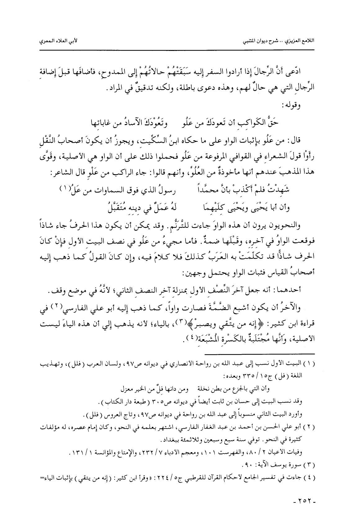 والنحويون يرون أن هذه الواو جاءت للترنم. وقد يمكن أن يكون هذا الحرف جاء شاذًا فوقعت الواو في آخره, وقبلها ضمة. فأما مجيء من علو في نصف البيت الأول فإن كان الحرف شاذًا قد تكلمت به العرب كذلك فلا كلام فيه, وإن كان القول كما ذهب إليه أصحاب القياس فثبات الواو يحتمل وجهين: