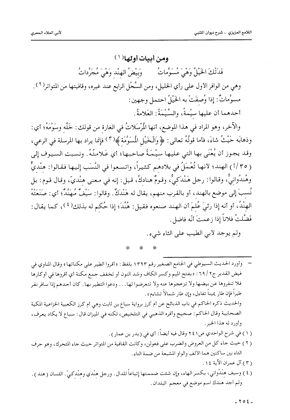 والآخر, وهو المراد في هذا الموضع, أنها المرسلات في الغارة من قولك: خله وسومه؛ أي: وذهابه حيث شاء, فأما قوله تعالى: {والخيل المسومة} فإنما يراد بها المرسلة في الرعي, وقد يجوز أن يعنى بها التي عليها سيمة صاحبها؛ أي علامته. ونسبت السيوف إلى (35/أ) الهند؛ لأنها تعمل في بلادهم كثيرًا, واتسعوا في النسب إليها فقالوا: هندي وهندواني, وقالوا: رجل هندكي, وقوم هنادك, قيل: إنه في معنى هندي, وقال قوم: بل نسب إلى موضع بالهند, أو بالقرب منهم, يقال له هندك. وقالوا: سيف مهند؛ أي: صنعته الهند, أو أنه إذا رئي علم أن الهند صنعوه فقيل: هند؛ إذا حكم له بذلك, كما يقال: فضلت فلانًا إذا زعمت أنه فاضل.