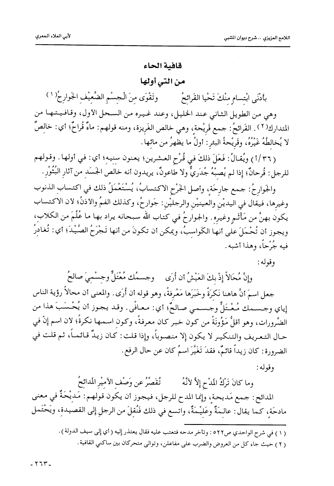 وهي من الطويل الثاني عند الخليل, وعند غيره من السحل الأول, وقافيتها من المتدارك. القرائح: جمع قريحةٍ, وهي خالص الغريزة, ومنه قولهم: ماء قراح؛ أي: خالص لا يخالطه غيره, وقريحة البئر: أول ما يظهر من مائها.