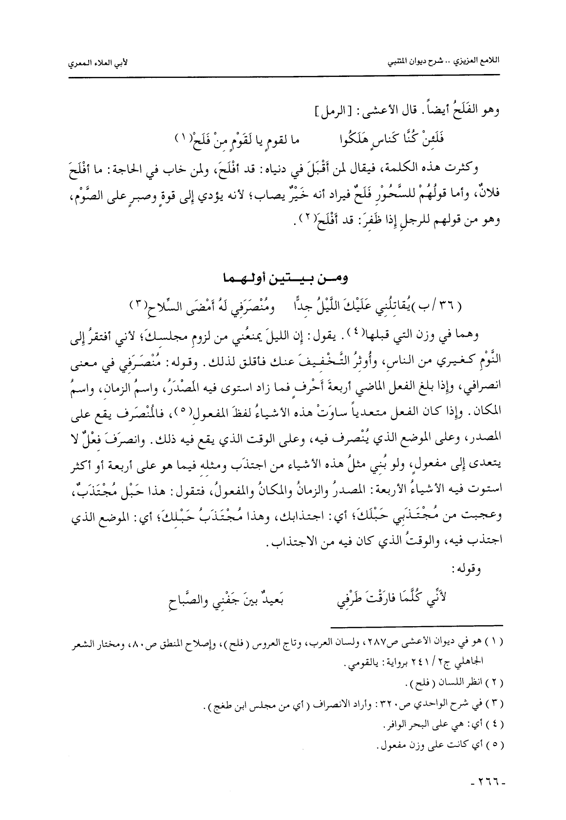 وهما في وزن التي قبلها. يقول: إن الليل يمنعني من لزوم مجلسك؛ لأني أفتقر إلى النوم كغيري من الناس, وأوثر التخفيف عنك فأقلق لذلك. وقوله: منصرفي في معنى انصرافي, وإذا بلغ الفعل الماضي أربعة أحرفٍ فما زاد استوى فيه المصدر, واسم الزمان, واسم المكان. وإذا كان الفعل متعديًا ساوت هذه الأشياء لفظ المفعول, فالمنصرف يقع على المصدر, وعلى الموضع الذي ينصرف فيه, وعلى الوقت الذي يقع فيه ذلك. وانصرف فعل لا يتعدى إلى مفعولٍ, ولو بني مثل هذه الأشياء من اجتذب ومثله فيما هو على أربعة أو أكثر استوت فيه الأشياء الأربعة: المصدر والزمان والمكان والمفعول, فتقول: هذا حبل مجتذب, وعجبت من مجتذبي حبلك؛ أي: اجتذابك, وهذا مجتذب حبلك؛ أي: الموضع الذي اجتذب فيه, والوقت الذي كان فيه من الاجتذاب.