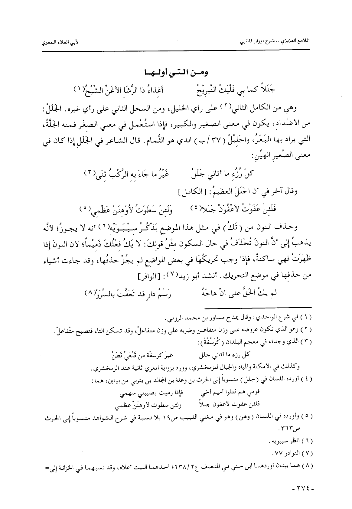 وهي من الكامل الثاني على رأي الخليل, ومن السحل الثاني على رأي غيره. الجلل: من الأضداد, يكون في معنى الصغير والكبير, فإذا استعمل في معنى الصغر فمنه الجلة, التي يراد بها البعر, والجليل (37/ب) الذي هو الثمام. قال الشاعر في الجلل إذا كان في معنى الصغير الهين: