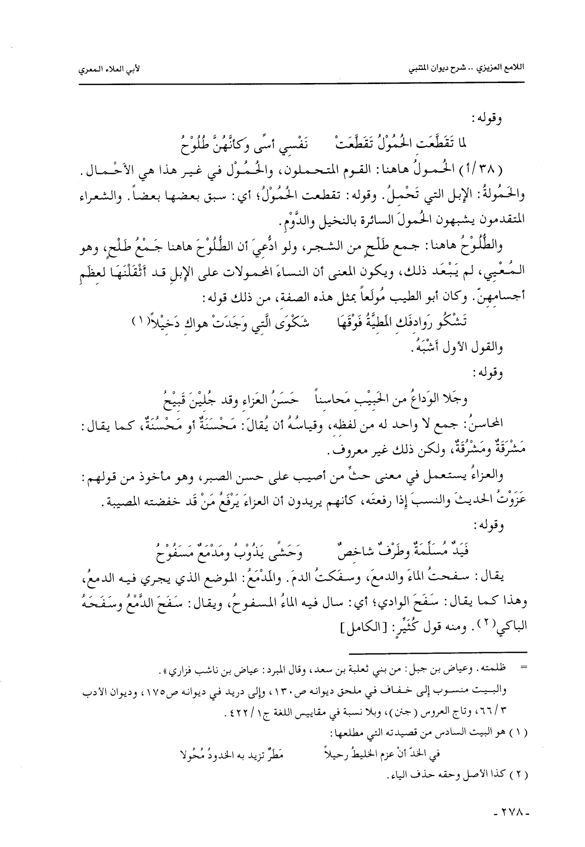 والطلوح هاهنا: جمع طلحٍ من الشجر, ولو ادعي أن الطلوح هاهنا طلحٍ, وهو المعيي, لم يبعد ذلك, ويكون المعنى أن النساء المحمولات على الإبل قد أثقلنها لعظم أجسامهن. وكان أبو الطيب مولعًا بمثل هذه الصفة, من ذلك قوله: