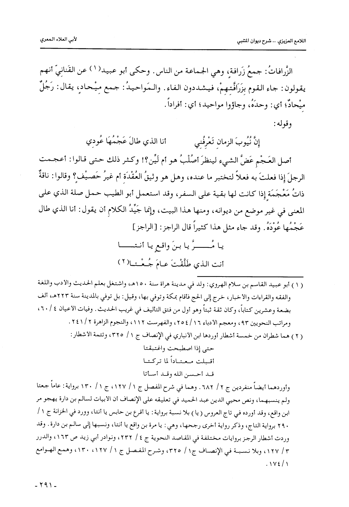 الزرافات: جمع زرافةٍ, وهي الجماعة من الناس. وحكى أبو عبيد عن القناني أنهم يقولون: جاء القوم برزافتهم, فيشددون الفاء. والمواحيد: جمع ميحادٍ, يقال: رجل ميحاد؛ أي: وحده, وجاؤوا مواحيد؛ أي: أفرادًا.
