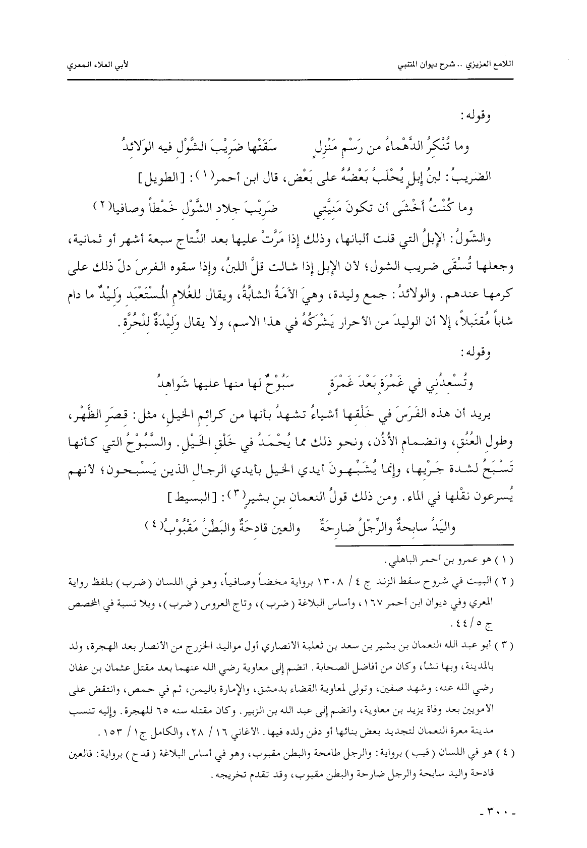 والشول: الإبل التي قلت ألبانها, وذلك إذا مرت عليها بعد النتاج سبعة أشهر أو ثمانية, وجعلها تسقى ضريب الشول؛ لأن الإبل إذا شالت قل اللبن, وإذا سقوه الفرس دل ذلك على كرمها عندهم. والولائد: جمع وليدة, وهي الأمة الشابة, ويقال للغلام المسعبد وليد ما دام شابًا مقتبلًا, إلا أن الوليد من الأحرار يشركه في هذا الاسم, ولا يقال وليدة للحرة.