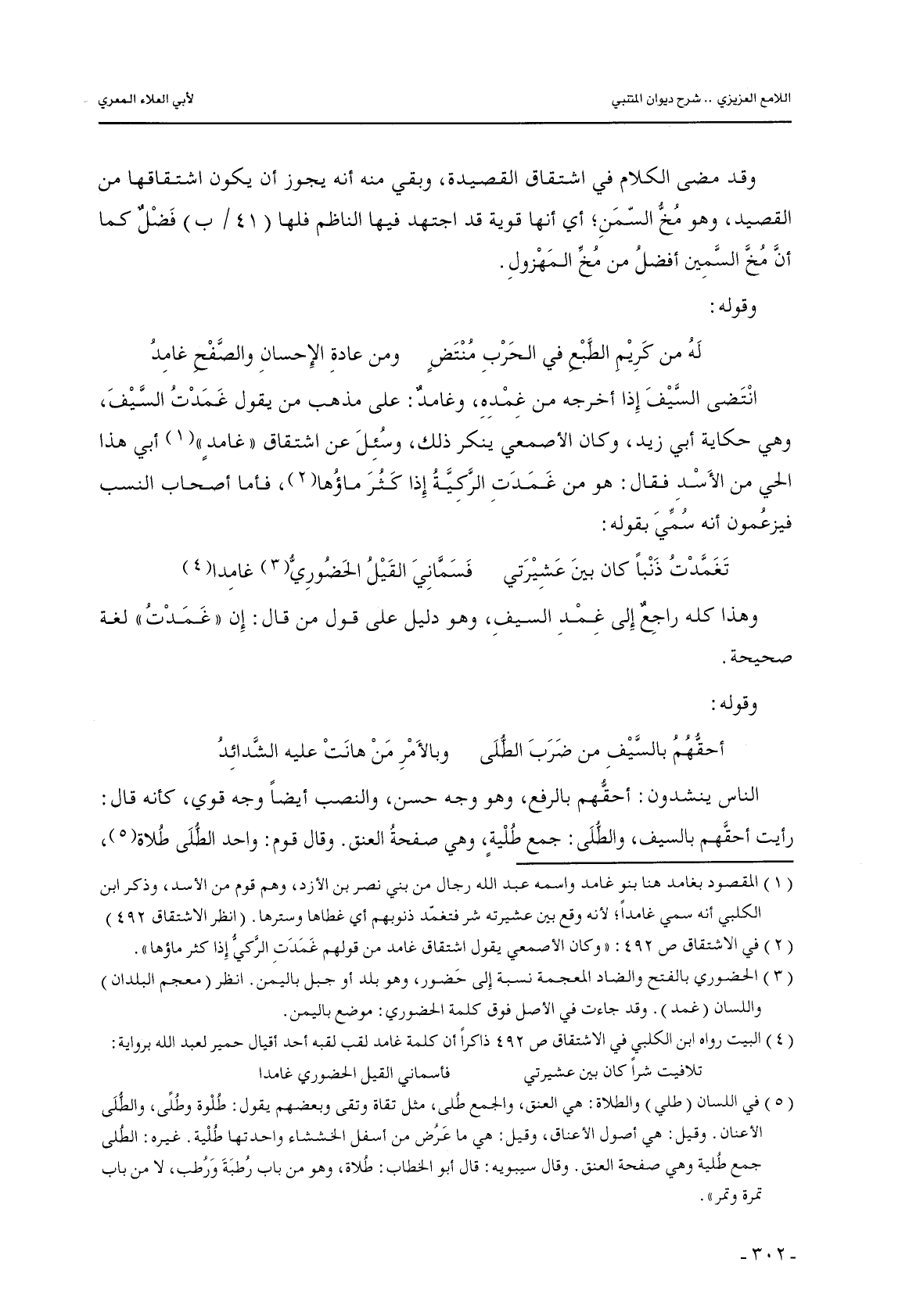 انتضى السيف إذا أخرجه من عمده, وغامد: على مذهب من يقول غمدت السيف, وهي حكاية أبي زيد, وكان الأصمعي ينكر ذلك, وسئل عن اشتقاق «غامدٍ» أبي هذا الحي من الأسد فقال: هو من غمدت الركية إذا كثر ماؤها, فأما أصحاب النسب فيزعمون أنه سمي بقوله: