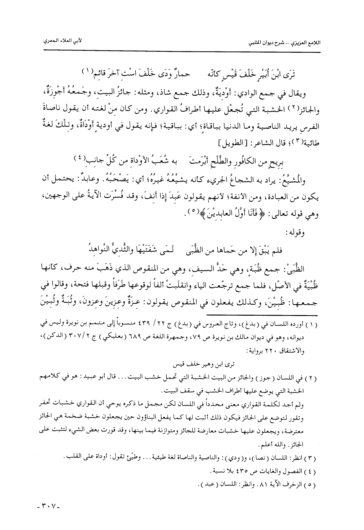 ويقال في جمع الوادي: أودية, وذلك جمع شاذ, ومثله: جائز البيت, وجمعه أجوزة, والجائز الخشبة التي تجعل عليها أطراف القواري. ومن كان من لغته أن يقول ناصاة الفرس يريد الناصية وما الدنيا بباقاةٍ؛ أي: بباقية؛ فإنه يقول في أوديةٍ أوداة, وتلك لغة طائية؛ قال الشاعر: [الطويل]