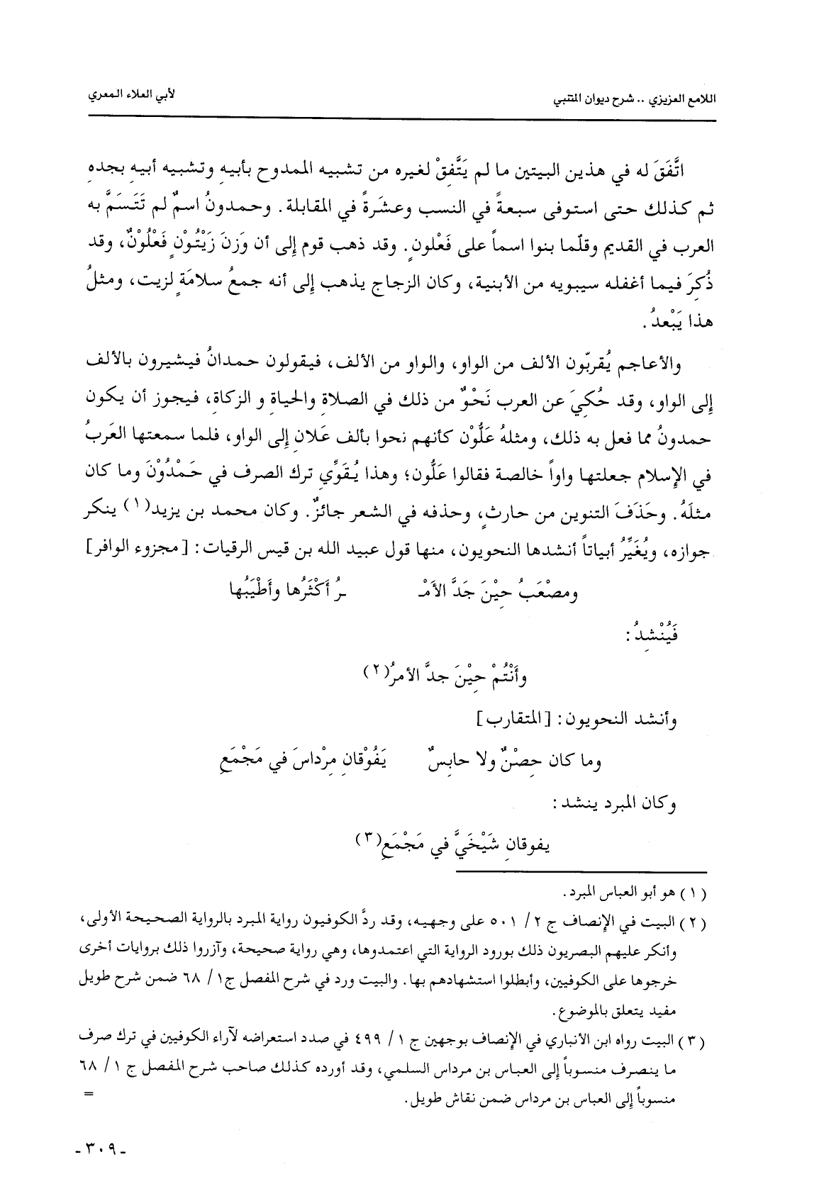 والأعاجم يقربون الألف من الواو, والواو من الألف, فيقولون حمدان فيشيرون بالألف إلى الواو, وقد حكي عن العرب نحو من ذلك في الصلاة والحياة والزكاة, فيجوز أن يكون حمدون مما فعل به ذلك, ومثله علون كأنهم نحوا بألف علان إلى الواو, فلما سمعتها العرب في الإسلام جعلتها واوًا خالصة فقالوا علون؛ وهذا يقوي ترك الصرف في حمدون وما كان مثله. وحذف التنوين من حارثٍ, وحذفه في الشعر جائز. وكان محمد بن يزيد ينكر جوازه, ويغير أبياتًا أنشدها النحويون, منها قول عبيد الله بن قيس الرقيات: [مجزوء الوافر]
