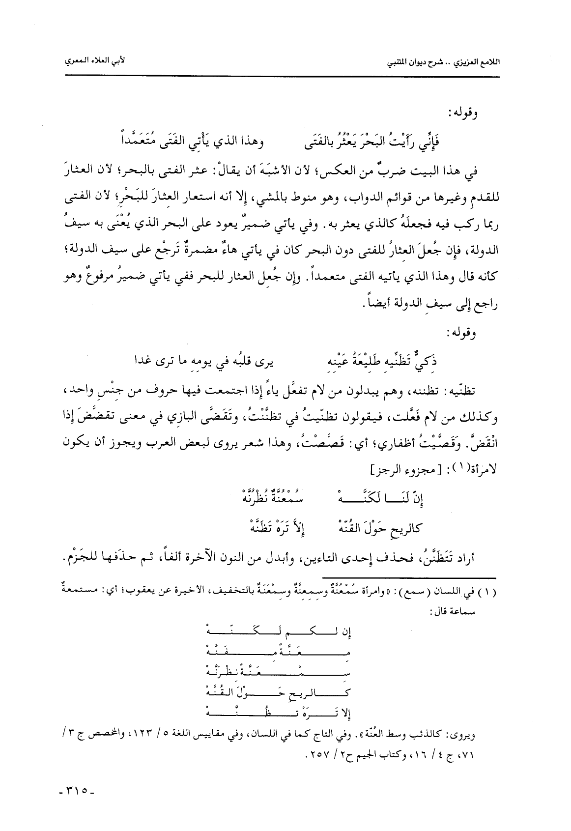 في هذا البيت ضرب من العكس؛ لأنه الأشبه أن يقال: عثر الفتى بالبحر؛ لأن العثار للقدم وغيرها من قوائم الدواب, وهو منوط بالمشي, إلا أنه استعار العثار للبحر؛ لأن الفتى ربما ركب فيه فجعله كالذي يعثر به. وفي يأتي ضمير يعود على البحر الذي يعنى به سيف الدولة, فإن جعل العثار للفتى دون البحر كان في يأتي هاء مضمرة ترجع على سيف الدولة؛ كأنه قال وهذا الذي يأتيه الفتى متعمدًا. وإن جعل العثار للبحر ففي يأتي ضمير مرفوع وهو راجع إلى سيف الدولة أيضًا.