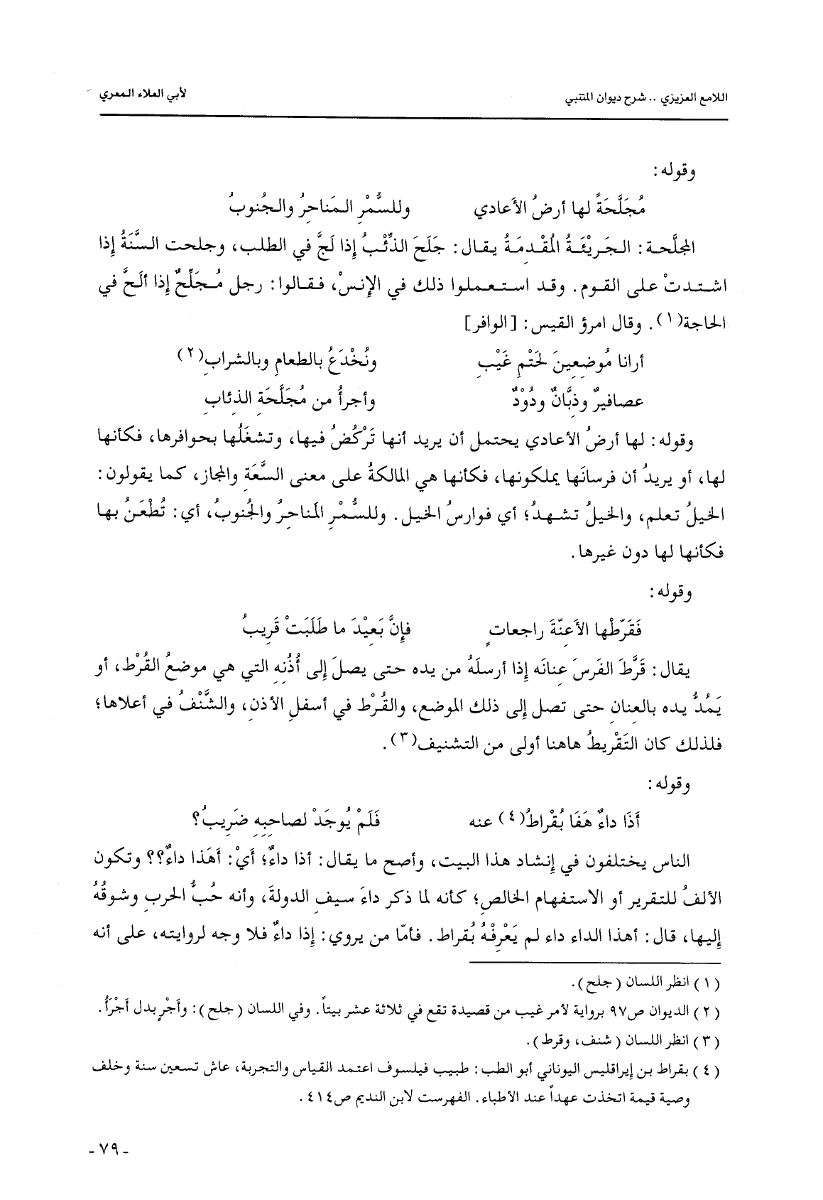 الناس يختلفون في إنشاد هذا البيت, وأصح ما يقال: أذا داء؛ أي: أهذا داء؟ ؟ وتكون الألف للتقرير أو الاستفهام الخالص؛ كأنه لما ذكر داء سيف الدولة, وأنه حب الحرب وشوقه إليها, قال: أهذا الداء داء لم يعرفه بقراط. فأما من يروي: إذا داء فلا وجه لروايته, على أنه