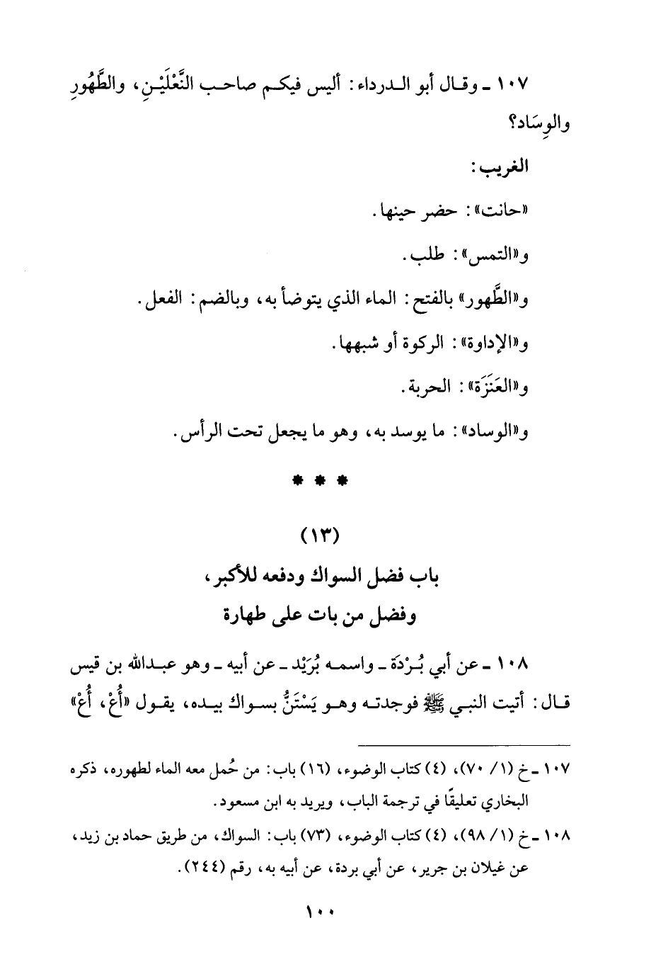108 - عن أبي بُرْدَة -واسمه بُرَيْد- عن أبيه -وهو عبد اللَّه بن قيس قال: أتيت النبي -صلى اللَّه عليه وسلم- فوجدته وهو يَسْتَنُّ بسواك بيده، يقول "أُعْ، أُعْ"
