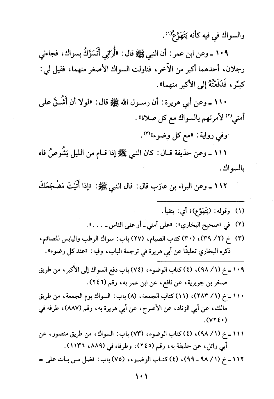 109 - وعن ابن عمر: أن النبي -صلى اللَّه عليه وسلم- قال: "أُرَانِي أَتَسَوَّكُ بسواك، فجاءني رجلان، أحدهما أكبر من الآخر، فناولت السواك الأصغر منهما، فقيل لي: كبِّر، فَدَفَعْتُهُ إلى الأكبر منهما".