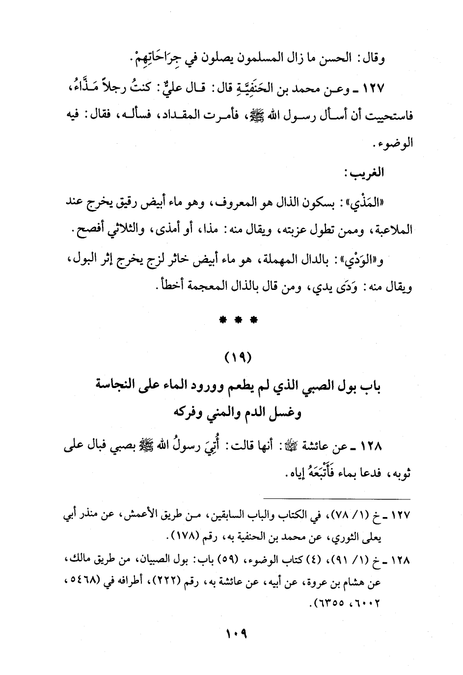 127 - وعن محمد بن الحَنَفِيَّةِ قال: قال عليٌّ: كنتُ رجلًا مَذَّاءُ، فاستحييت أن أسأل رسول اللَّه -صلى اللَّه عليه وسلم-، فأمرت المقداد، فسأله، فقال: فيه الوضوء.