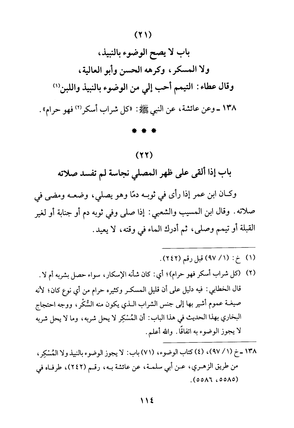 138 - خ (1/ 97)، (4) كتاب الوضوء، (71) باب: لا يجوز الوضوء بالنبيذ ولا المُسْكِر، من طريق الزهري، عن أبي سلمة، عن عائشة به، رقم (242)، طرفاه في (5585، 5586).
