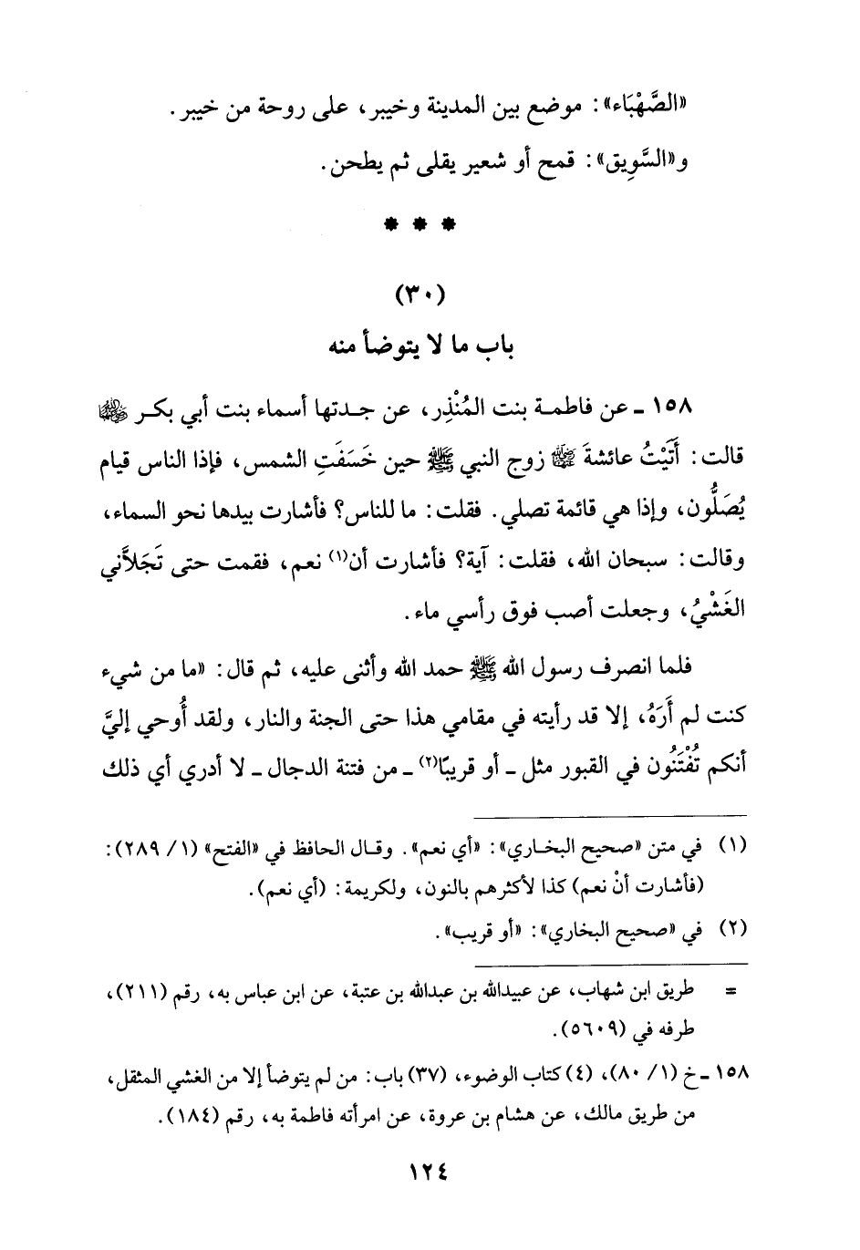 158 - خ (1/ 80)، (4) كتاب الوضوء، (37) باب: من لم يتوضأ إلا من الغشي المثقل، من طريق مالك، عن هشام بن عروة، عن امرأته فاطمة به، رقم (184).