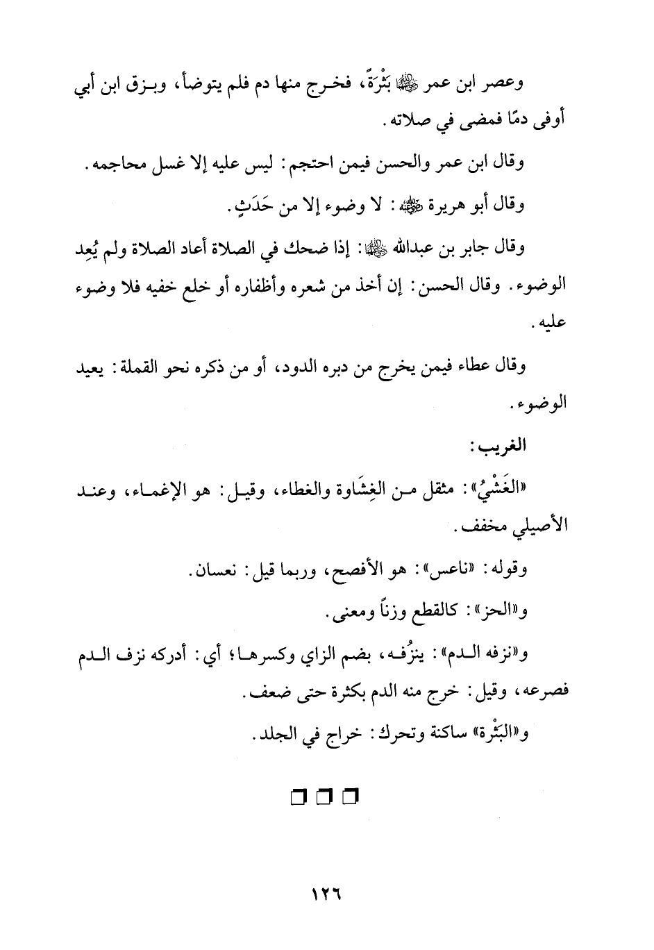وعصر ابن عمر -رضي اللَّه عنهما- بَثْرَةً، فخرج منها دم فلم يتوضأ، وبزق ابن أبي أوفى دمًا فمضى في صلاته.