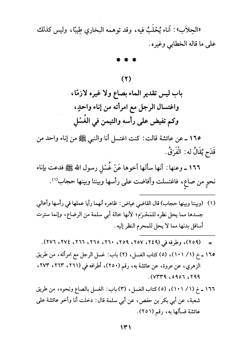 166 - وعنها: أنها سألها أخوها عَنْ غُسْلِ رسول اللَّه -صلى اللَّه عليه وسلم- فدعت بإناء نحوٍ من صاعٍ، فاغتسلت وأفاضت على رأسها وبيننا وبينها حجاب (¬1).
