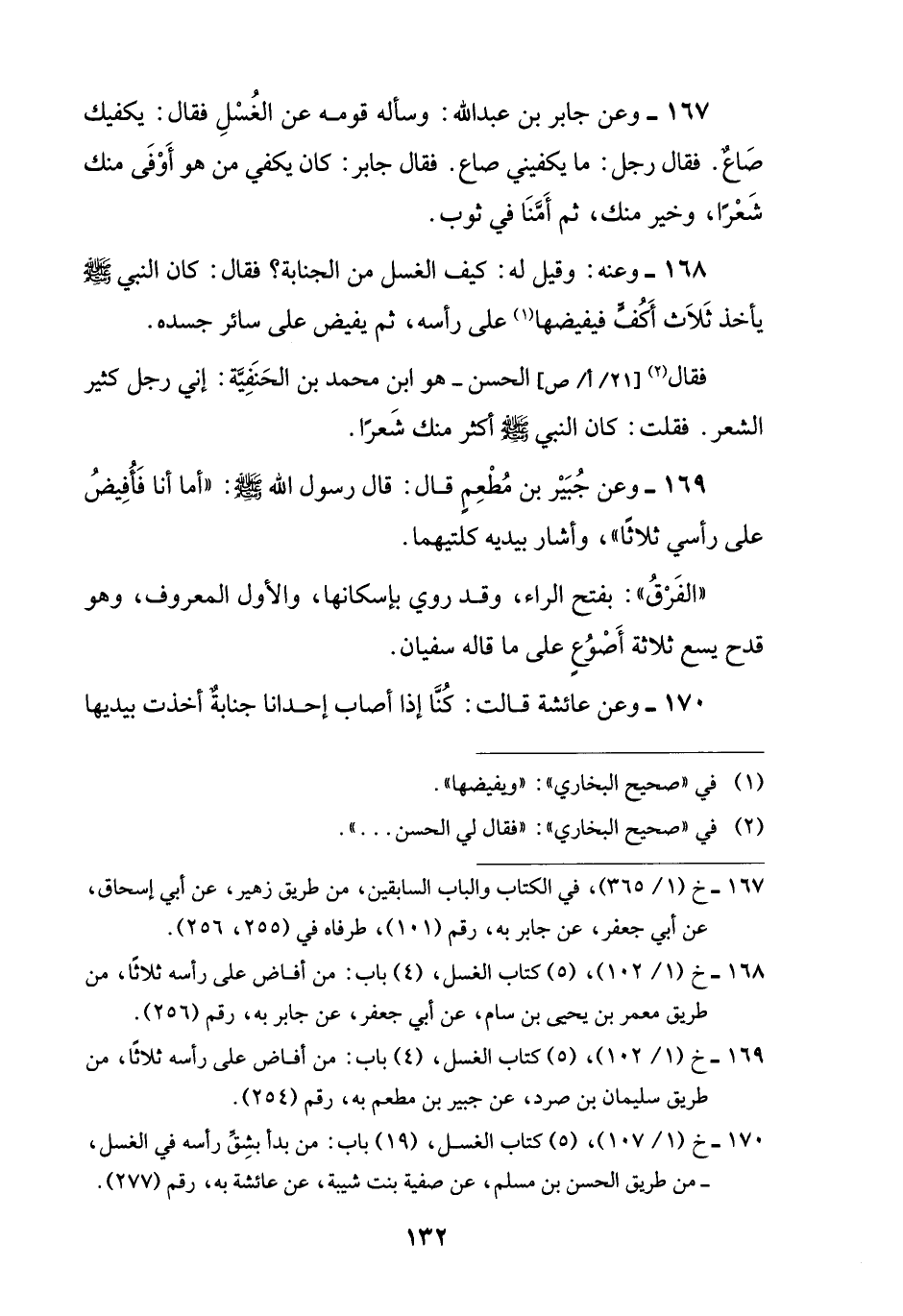 167 - وعن جابر بن عبد اللَّه: وسأله قومه عن الغُسْلِ فقال: يكفيك صَاعٌ. فقال رجل: ما يكفيني صاع. فقال جابر: كان يكفي من هو أَوْفَى منك شَعْرًا، وخير منك، ثم أَمَّنَا في ثوب.