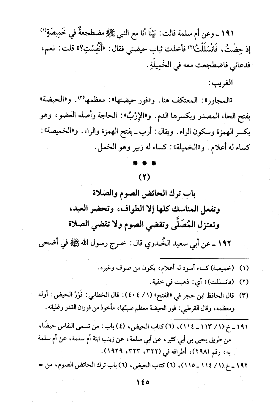 191 - وعن أم سلمة قالت: بَيْنَا أنا مع النبي -صلى اللَّه عليه وسلم- مضطجعةٌ في خَمِيصَةٍ (¬1) إذ حِضْتُ، فَانسلَلْتُ (¬2) فأخذت ثياب حيضتي فقال: "أَنُفِسْتِ؟ " قلت: نعم، فدعاني فاضطجعت معه في الخَمِيلَةِ.
