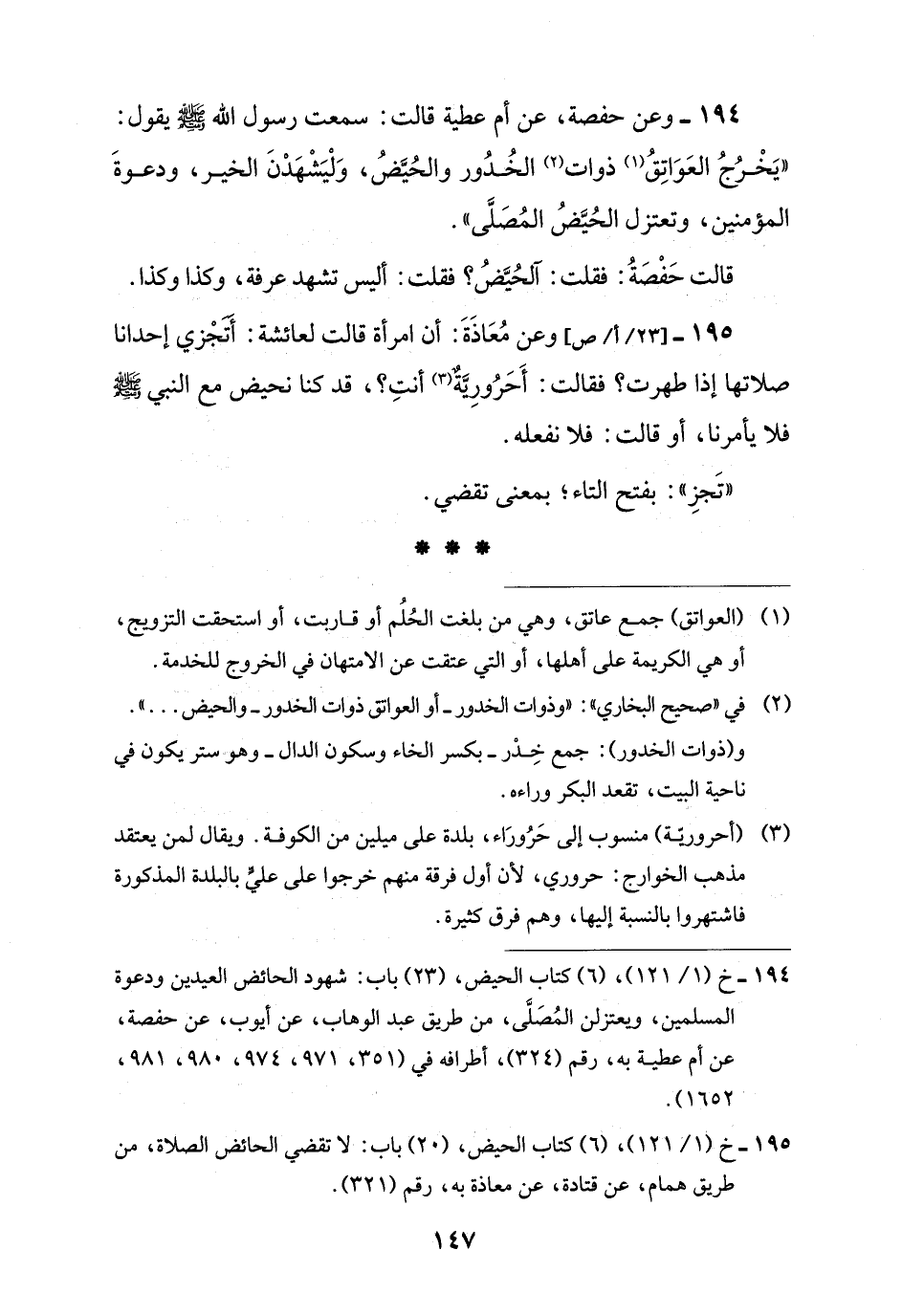 195 - وعن مُعَاذَةَ: أن امرأة قالت لعائشة: أَتَجْزي إحدانا صلاتها إذا طهرت؟ فقالت: أَحَرُورِيَّةٌ (¬3) أنتِ؟ ، قد كنا نحيض مع النبي -صلى اللَّه عليه وسلم- فلا يأمرنا، أو قالت: فلا نفعله.
