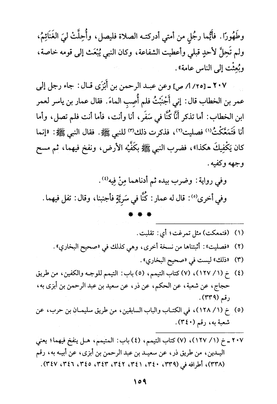 207 - خ (1/ 127)، (7) كتاب التيمم، (4) باب: المتيمم، هل ينفخ فيهما؛ يعني اليدين، من طريق ذر، عن سعيد بن عبد الرحمن بن أبزى، عن أبيه به، رقم (338)، أطرافه في (339، 340، 341، 342، 343، 345، 346، 347).