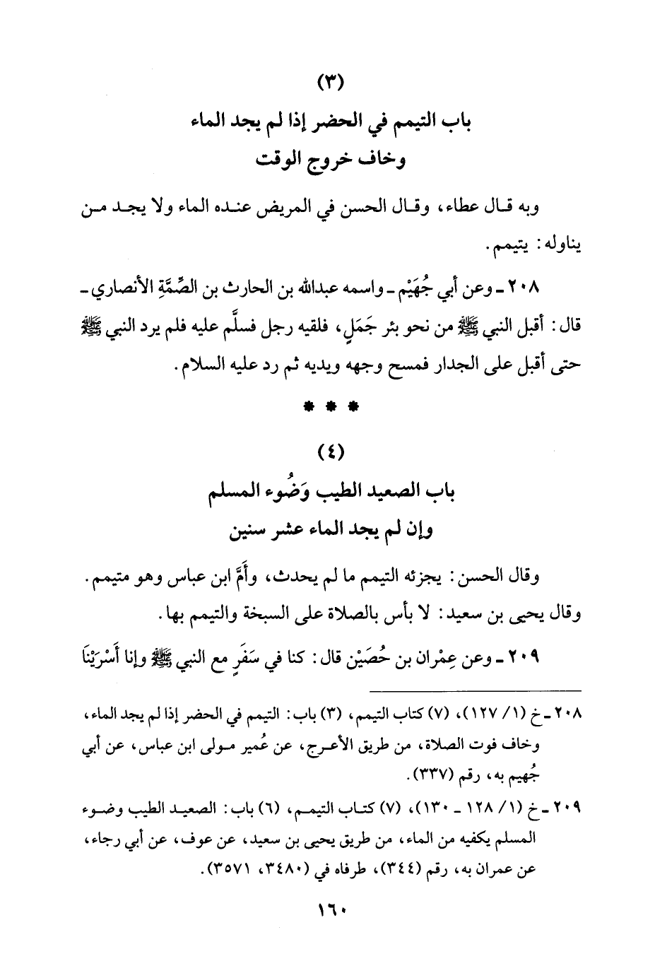 208 - وعن أبي جُهَيْم -واسمه عبد اللَّه بن الحارث بن الصِّمَّةِ الأنصاري- قال: أقبل النبي -صلى اللَّه عليه وسلم- من نحو بئر جَمَلٍ، فلقيه رجل فسلَّم عليه فلم يرد النبي -صلى اللَّه عليه وسلم- حتى أقبل على الجدار فمسح وجهه ويديه ثم رد عليه السلام.