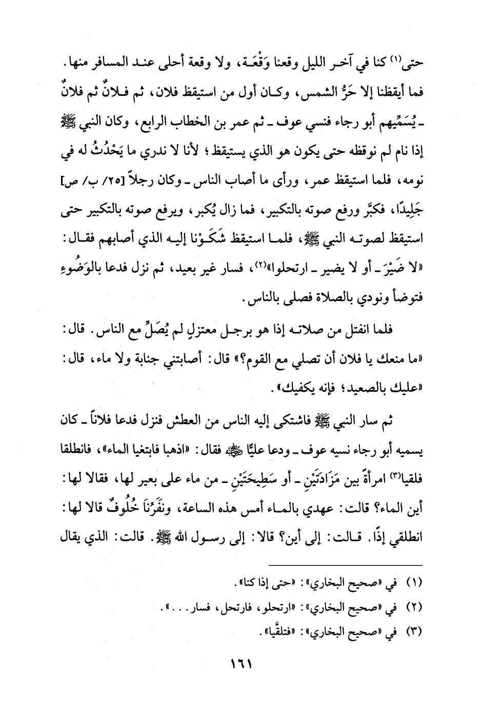 ثم سار النبي -صلى اللَّه عليه وسلم- فاشتكى إليه الناس من العطش فنزل فدعا فلانًا -كان يسميه أبو رجاء نسيه عوف- ودعا عليًّا -رضي اللَّه عنه- فقال: "اذهبا فابتغيا الماء"، فانطلقا فلقيا (¬3) امرأةً بين مَزَادَتَيْنِ -أو سَطِيحَتَيْنِ- من ماء على بعير لها، فقالا لها: أين الماء؟ قالت: عهدي بالماء أمس هذه الساعة، ونَفَرُناَ خُلُوفٌ قالا لها: انطلقي إذًا. قالت: إلى أين؟ قالا: إلى رسول اللَّه -صلى اللَّه عليه وسلم-. قالت: الذي يقال