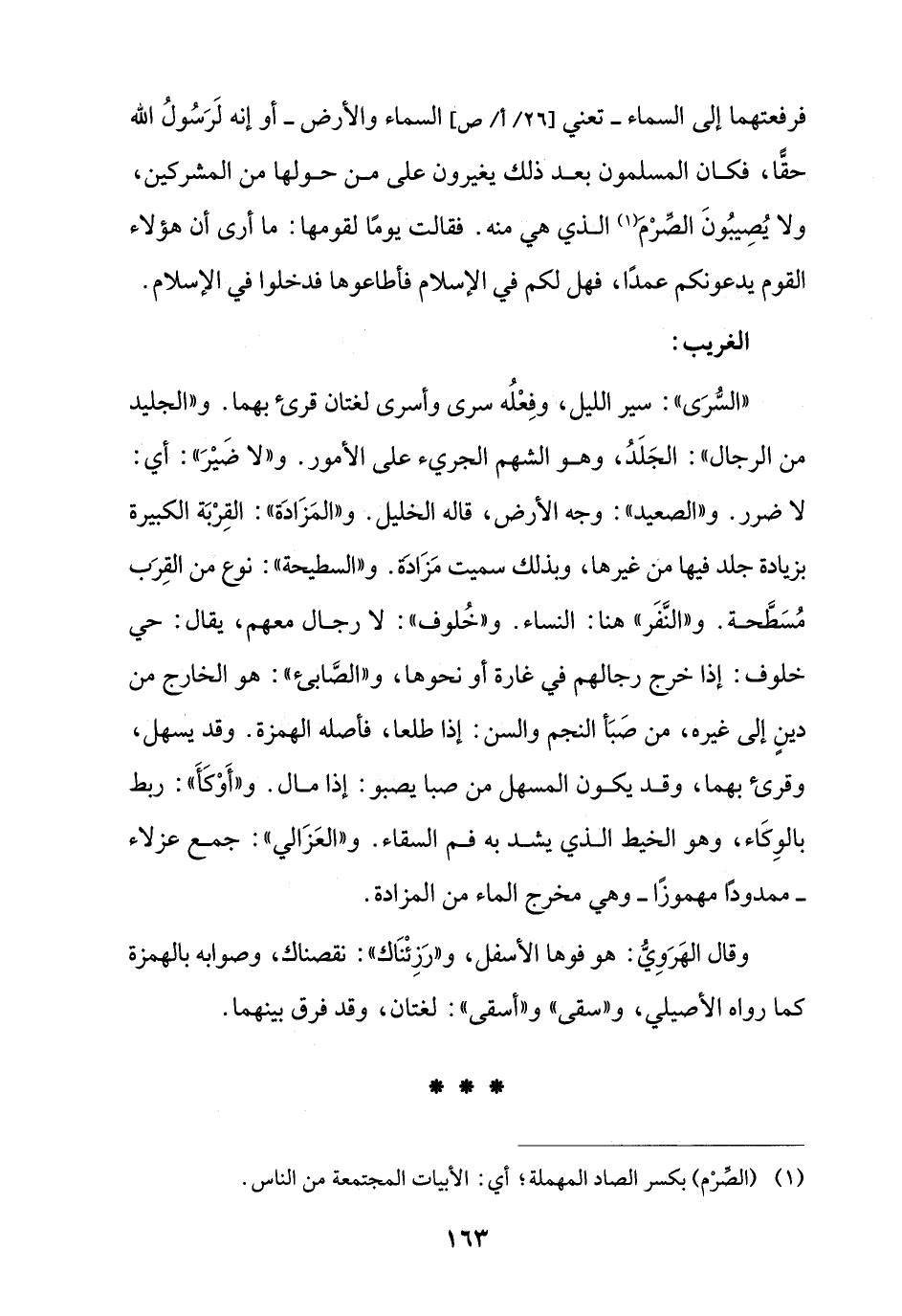 "السُّرَى": سير الليل، وفِعْلُه سرى وأسرى لغتان قرئ بهما. و"الجليد من الرجال": الجَلَدُ، وهو الشهم الجريء على الأمور. و"لا ضَيْرَ": أي: لا ضرر. و"الصعيد": وجه الأرض، قاله الخليل. و"المَزَادَة": القِرْبَة الكبيرة بزيادة جلد فيها من غيرها، وبذلك سميت مَزَادَه. و"السطيحة": نوع من القِرَب مُسَطَّحة. و"النَّفَر" هنا: النساء. و"خُلوف": لا رجال معهم، يقال: حي خلوف: إذا خرج رجالهم في غارة أو نحوها، و"الصَّابئ": هو الخارج من دين إلى غيره، من صَبَأ النجم والسن: إذا طلعا، فأصله الهمزة. وقد يسهل، وقرئ بهما، وقد يكون المسهل من صبا يصبو: إذا مال. و"أَوْكَأَ": ربط بالوِكَاء، وهو الخيط الذي يشد به فم السقاء. و"العَزَالي": جمع عزلاء -ممدودًا مهموزًا- وهي مخرج الماء من المزادة.